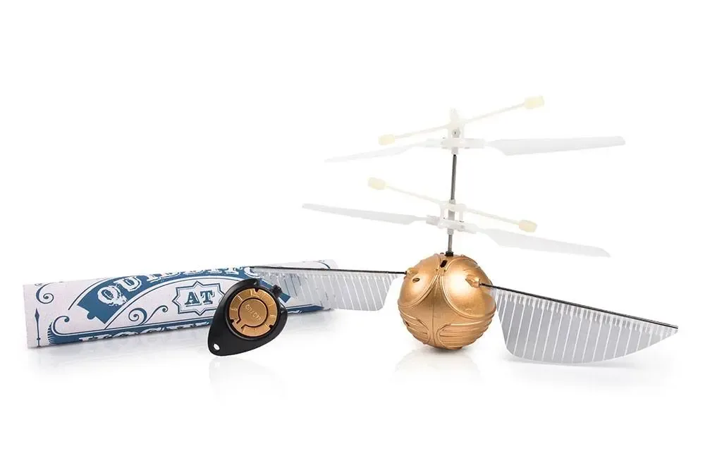 Wir machen den Traum aller Harry Potter Fans wahr: Der Golden Snitch Heliball ist ein Goldener Schnatz im Original-Look, der wirklich fliegen kann! Möglich macht dies eine patentierte Sensortechnologie, die auf Handberührung reagiert. Die Flügel können verstellt werden, um die Flugbahn zu beeinflussen, und flattern ganz so, wie es Fans erwarten dürfen. Der Goldene Schnatz fliegt auf und ab, im Kreis und in Kreiselbewegung mit einem Radius von bis zu fünf Metern. Aufgeladen wird er einfach über das beiliegende USB-Kabel und macht sich dank beiliegenden Ständers auch als einmalige Fan-Deko perfekt. Ersatzflügel verlängern den Quidditch-Spaß noch weiter und für den richtigen Look beim Quidditch-Cup sorgt das liebevoll gestaltete Fanposter.
