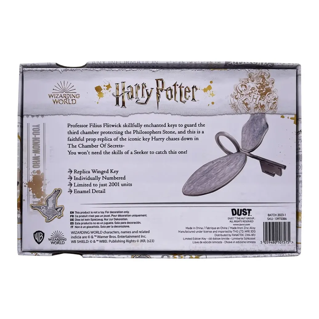 Setze deine Sucher-Fähigkeiten ein, um diese Harry Potter-Nachbildung zu fangen! In Anlehnung an die Kammer des Schreckens ist dieses Sammlerstück eine Nachbildung des verzauberten, geflügelten Schlüssels, der die dritte Kammer, die den Stein der Weisen schützt, öffnet. Dieses Sammlerstück ist weltweit auf 2001 limitiert (Jahr der Filmveröffentlichung), hat Emaille-Details und ist einzeln nummeriert.