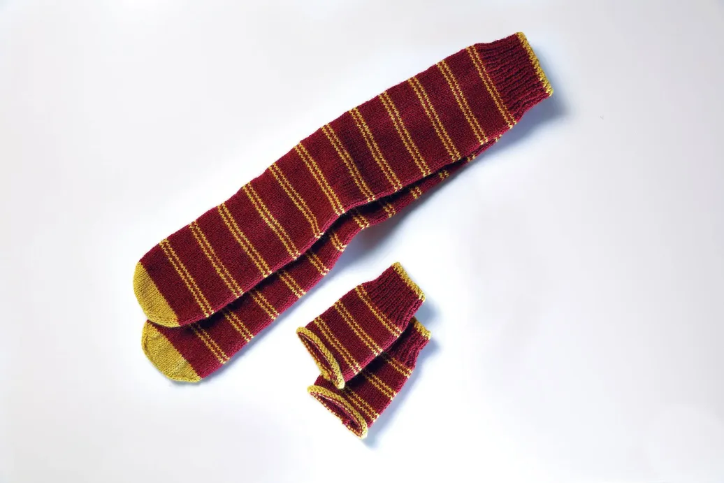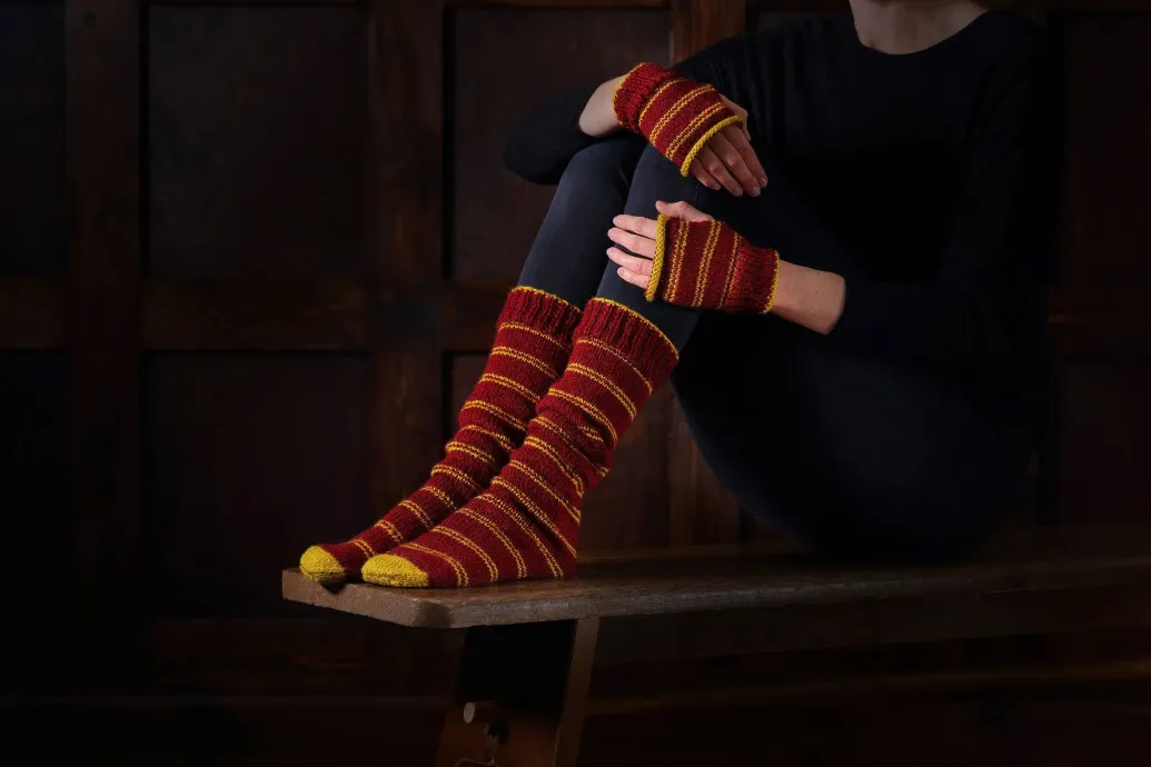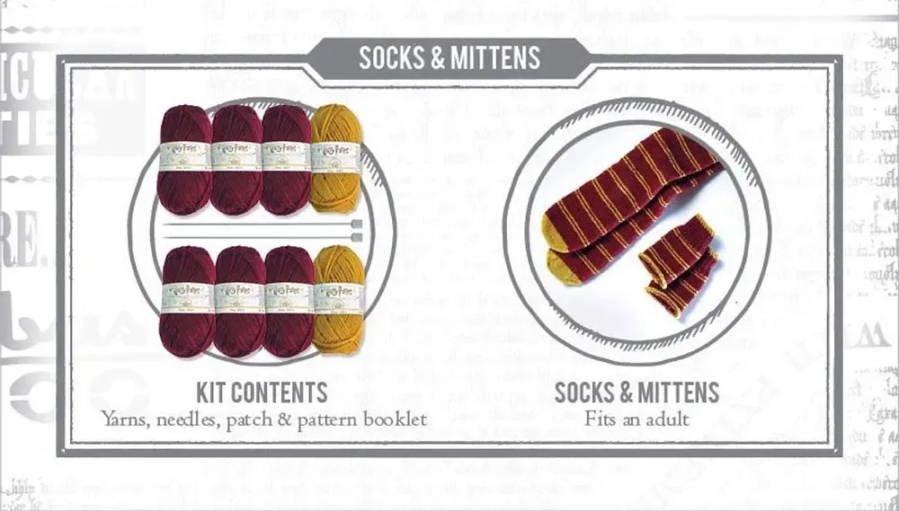 Dieses Strickset enthält alles, was du brauchst, um original Haussocken und Fäustlinge in den Farben von Gryffindor anzufertigen: Wolle, Stricknadeln und Strickmuster.