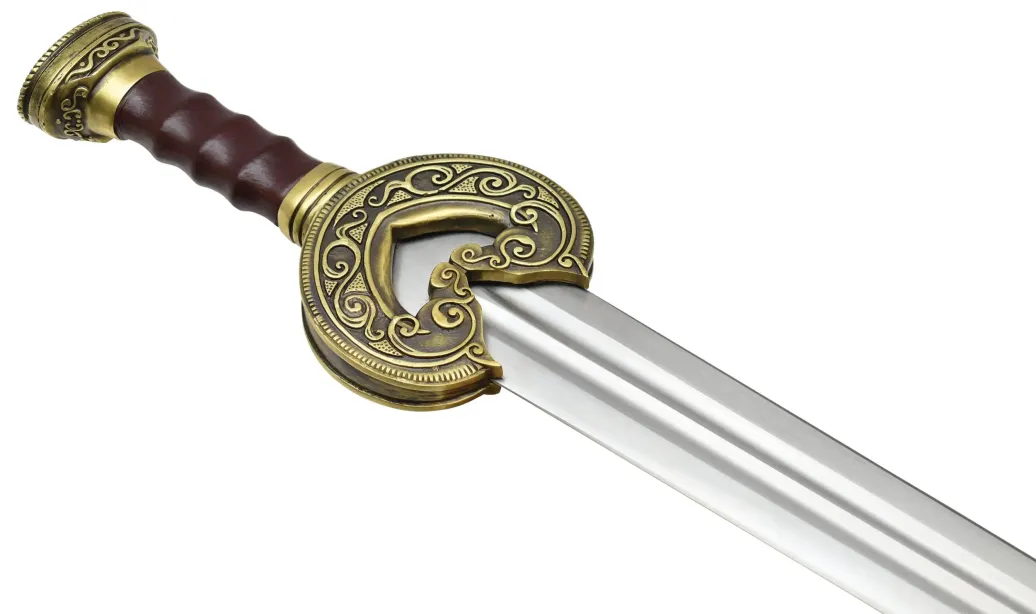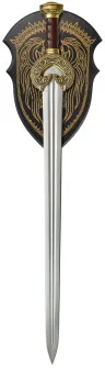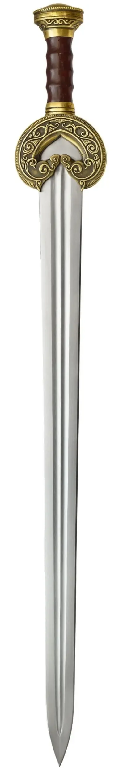 Diese neue Battle Forged-Ausgabe des beliebten Herugrim-Schwerts aus den Der Herr der Ringe™-Filmen wird auf traditionelle Weise mit einer Vollerl-Klinge, einer Klinge aus gehärtetem 1070-Kohlenstoffstahl und im Wachsausschmelzverfahren gegossenen Griffteilen hergestellt. Die Klinge verfügt über eine doppelte Hohlkehle und einen durchgehenden Erl, der durch den Knauf gestrahlt ist, genau wie die Requisiten aus echtem Stahl für Heldenfilme. Der Griff verfügt über einen Schlagschutz und Knauf aus massivem Messing mit feinen Details und einer gealterten und abgenutzten Oberfläche. Der mit echtem Leder umwickelte Griff ist aus echtem Holz geformt. Das Herugrim Schwert wird mit einem Wanddisplay aus schwarz-goldenem Holz und einem Echtheitszertifikat geliefert.