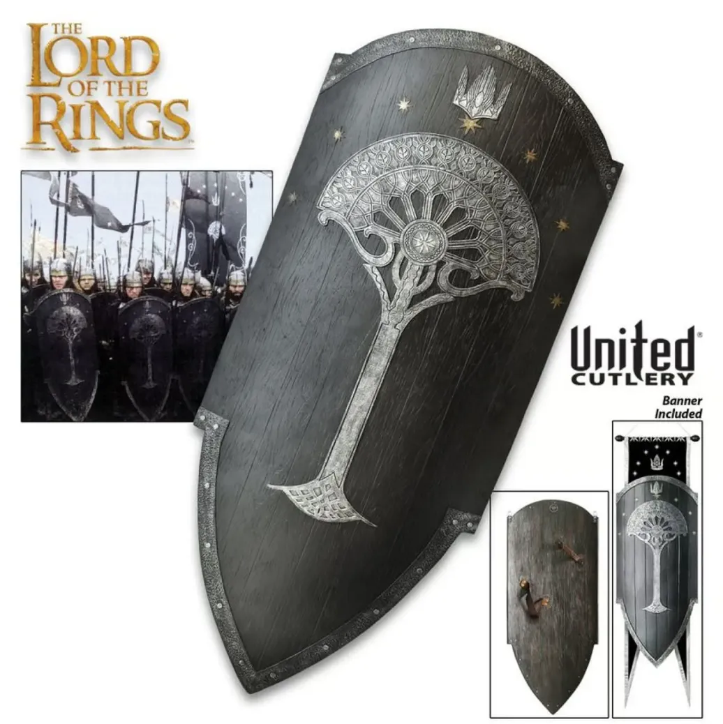 Erlebe die Größe Gondors mit unserem Schild von Gondor aus dem Zweiten Zeitalter, einer makellosen Replik aus dem Herr der Ringe-Franchise. Dieses exquisite Stück ist eine originalgetreue Nachbildung des ikonischen Schildes, den die tapferen Soldaten der Weißen Stadt während des letzten Bündnisses von Elben und Menschen trugen. Gefertigt aus hartem Polyresin, ist jedes Detail der Originalrequisite mit unvergleichlicher Präzision eingefangen worden. Die erhabenen Reliefs mit dem Baum von Gondor und den Kronenmotiven zeigen die Hingabe an die Authentizität, mit der dieses Meisterwerk geschaffen wurde. Zum Schild gehören ein Kriegsbanner von Gondor aus Stoff, ein Trageriemen, ein praktischer Griff auf der Rückseite und Befestigungsmaterial für die Wand. Mit den beeindruckenden Maßen von 113 x 48 cm zieht dieser Schild in jeder Umgebung die Aufmerksamkeit auf sich. Egal, ob du ein eingefleischter Fan von Tolkiens Welt bist oder einfach nur die Kunstfertigkeit von Filmrequisiten schätzt, das Kriegsschild von Gondor aus dem Zweiten Zeitalter ist ein Muss für deine Sammlung.