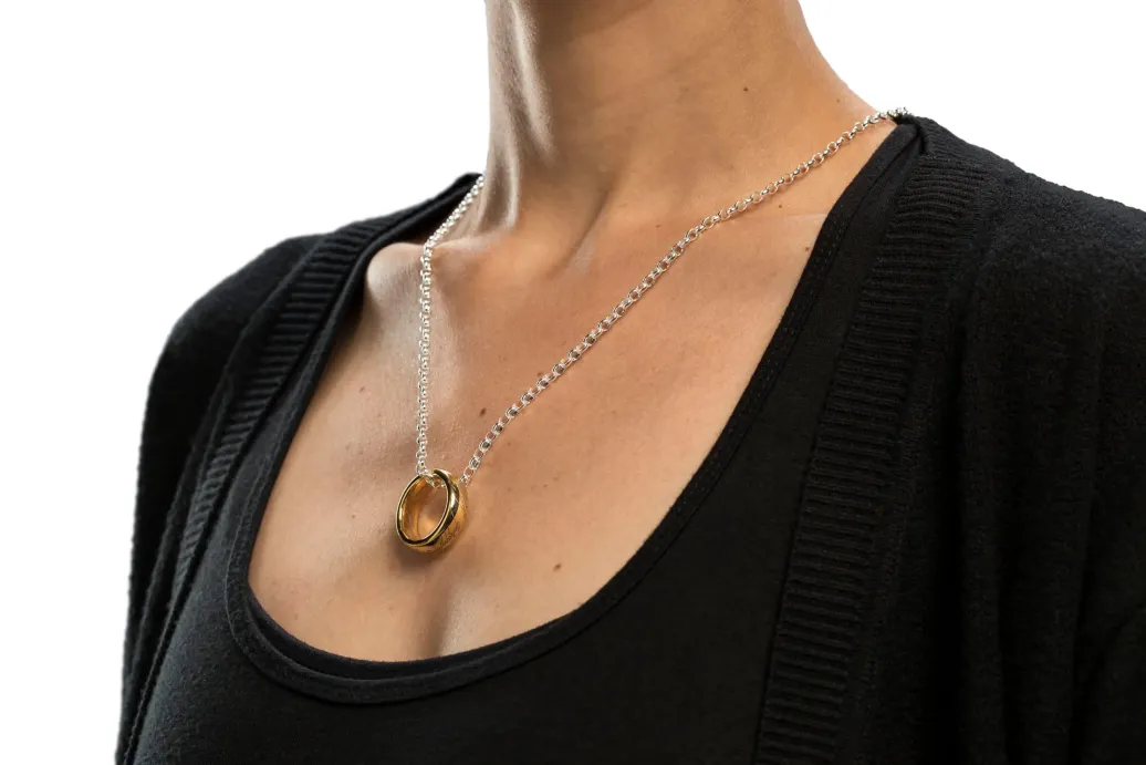 Der Ring aller Ringe aus 18 Karat vergoldetem Wolfram mit laser-geätzter Inschrift. Der Eine Ring im zeitlosen Design wird in einer schicken Schatulle aus Nussbaumholz geliefert.