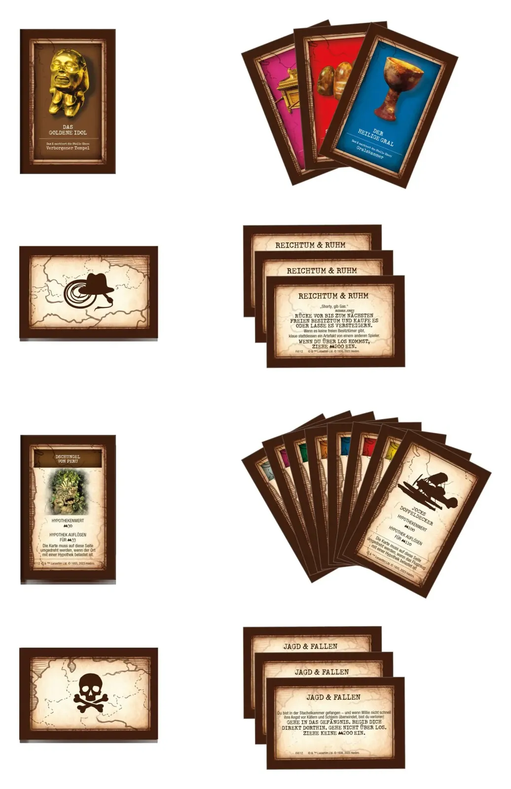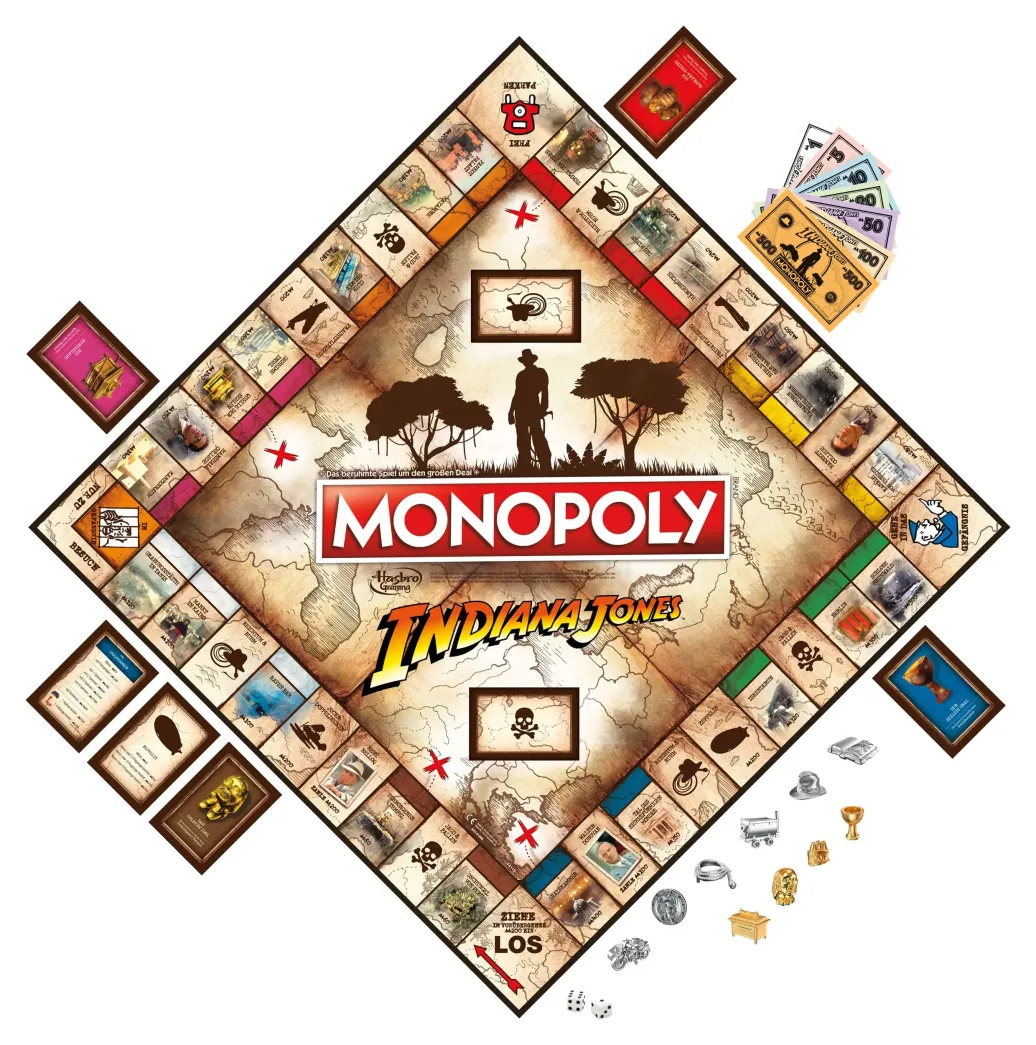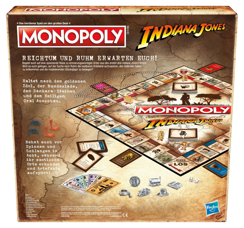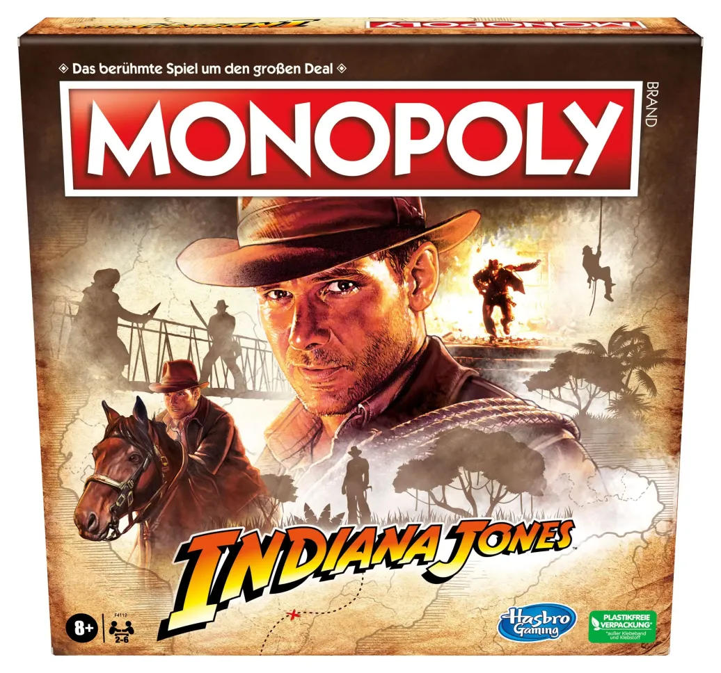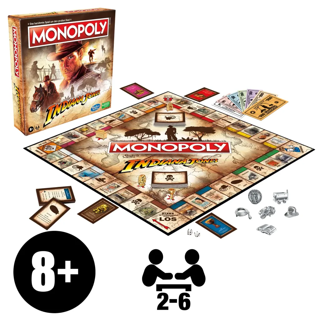 Reichtum, Ruhm und Schlangen! Beim Monopoly Spiel Indiana Jones begeben sich die Spieler auf eine Weltreise zu Indys Abenteuern und lassen unvergessliche Momente aus den ersten 3 Indiana Jones Filmen aufleben! Dabei versuchen sie, die Kontrolle über Orte wie die Quelle der Seelen und den Tempel des Todes zu übernehmen, Jocks Doppeldecker und andere Flugzeuge zu sichern und das goldene Idol, den Heiligen Gral und mehr zu finden. Auf ihrer Suche nach Ruhm müssen die Spieler die gefährlichen Fallen und gruseligen Spinnen und Schlangen überwinden. Wer als letzter Spieler noch Geld hat, während alle anderen pleite sind, der gewinnt! Dieses Familienspiel für 2 bis 6 Spieler ist ein tolles Geschenk für die Fans von Indiana Jones Filmen und Monopoly sowie für Indiana Jones Sammler und Kinder ab 8 Jahren.