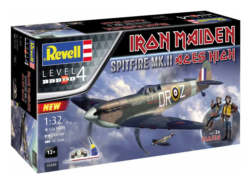 Modellbausatz einer Spitfire Mk. II im Design der Iron Maiden-Hit-Single "Aces High", mit der die Heavy Metal-Legenden den wagemutigen Piloten der "Battle of Britain" ein musikalisches Denkmal gesetzt haben.