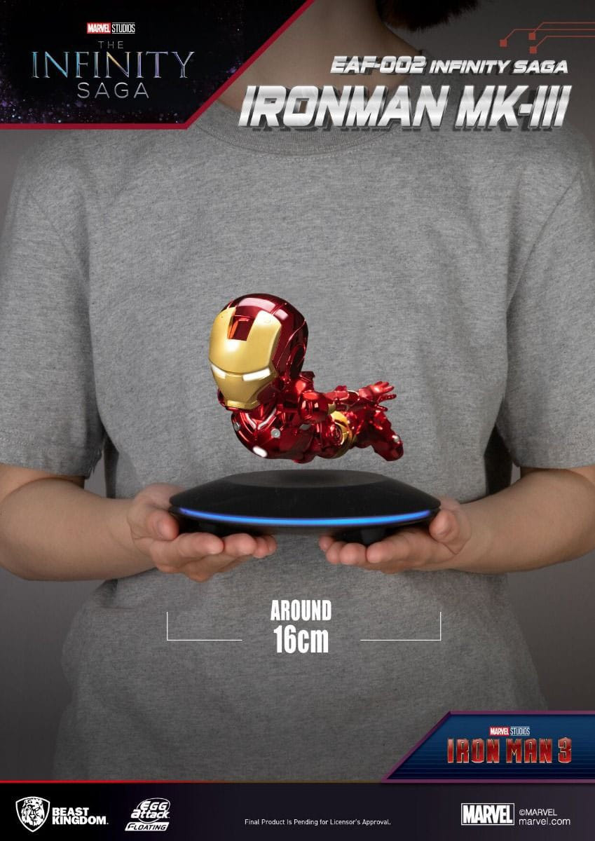 Zum Marvel Blockbuster "Iron Man 3" kommt dieses detailreiche Modell von Iron Man Mark III aus der Egg Attack Serie von Beast Kingdom Toys mit LED-Leuchtfunktion und Base mit Magnetschwebetechnik. Diese lässt Iron Man über der Base schweben. Größe: ca. 13 x 9 x 9 cm