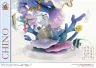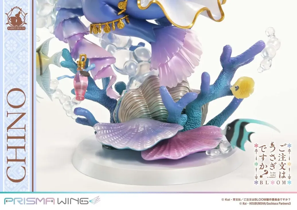 Eine coole und bezaubernde kleine Meerjungfrau. Die Bilderbuch-Illustration von „Chino“ feiert ihr Figurendebüt. Aus „Is the Order a Rabbit? BLOOM“ wurde die Bilderbuch-Illustration von „Chino“, inspiriert von einer kleinen Meerjungfrau, zum allerersten Mal als Figur zum Leben erweckt. Von ihrem sanften Gesichtsausdruck und ihrer sorgfältig komponierten Pose bis hin zur farbenfrohen Unterwasserwelt, die sie umgibt, wurde jedes Detail akribisch modelliert. Diese Figur zeigt „Chino“ in einem märchenhaften Look, der in ihrem sonst so kühlen Auftreten selten zu sehen ist, und präsentiert sie in voller Blüte bezaubernder Süße. [Besonderheit 01] Haarfarbe und Hautton, die ihren unschuldigen Charme unterstreichen. Chino, die Tippy fest umarmt und ihre Wange an ihn drückt, wird in ihrer unschuldigen Geste mit zarter Nuance eingefangen. Die Weichheit, die in ihrem Ausdruck erscheint, wird durch eine durchscheinende Haarfarbe und sorgfältig ausbalancierte Hauttöne noch verstärkt. [Besonderheit 02] Ein perlmuttfarbenes Kleid, das einen reinen und eleganten Eindruck erweckt. Das Kleid, das auf einer Palette von Weiß und Blau basiert, verfügt über einen perlmuttfarbenen Glanz, der seinen reinen und eleganten Eindruck verstärkt. Die goldenen Akzente sind in raffinierten Tönen gehalten und verleihen Eleganz, ohne übermäßig verziert zu wirken. [Besonderheit 03] Eine spezielle Korallenriff-Basis, die die Farben des Meeres und ein Gefühl des Schwebens hervorruft. Die speziell entworfene Basis ist von einem farbenprächtigen Korallenriff inspiriert. Elemente aus der Illustration, wie schwimmende Fische und aufsteigende Blasen, sind sorgfältig eingearbeitet, um die Farben des Meeres und ein Gefühl von schwebender Bewegung zu vermitteln.