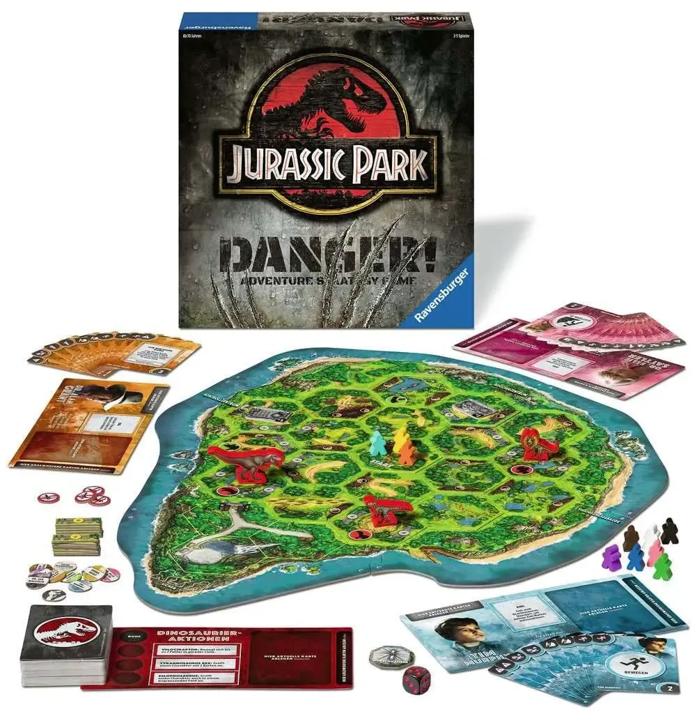 Willkommen im Jurassic Park! Die ersten Besucher sind angekommen, um die Dinosaurier zu sehen. Doch auf der Isla Nublar herrscht Chaos - der Strom ist ausgefallen, und die Kreaturen sind auf der Jagd! Ein Spieler steuert den T. Rex, den Dilophosaurus und den Velociraptor, die sich durch den Dschungel schleichen. Die anderen Spieler schlüpfen in die Rollen der Figuren aus dem Filmklassiker und versuchen, Jurassic Park wieder in Gang zu bringen und von der Insel zu fliehen!Dieses abenteuerliche Strategiespiel bietet viele Möglichkeiten - Zehn verschiedene Charaktere mit ihren eigenen, einzigartigen Zielen und ein modularer Isla Nublar-Spielplan ermöglichen einen hohen Wiederspielwert und variable Strategien. JAGE als Dinosaurier ... oder ÜBERLEBE als Mensch! Wenn ein Mensch von den Dinosauriern eliminiert wird, kommt dieser sofort mit einem brandneuen Charakter wieder ins Spiel. Wenn die Spieler eine bestimmte Anzahl von Menschen in Sicherheit bringen können, gewinnen die Menschen. Gelingt es dem Dinosaurier-Spieler jedoch, drei Menschen zu eliminieren, gewinnen die Dinosaurier. Nur wenn die Menschen gut zusammenarbeiten, schaffen die Spieler mit dem Hubschrauber zu entkommen!