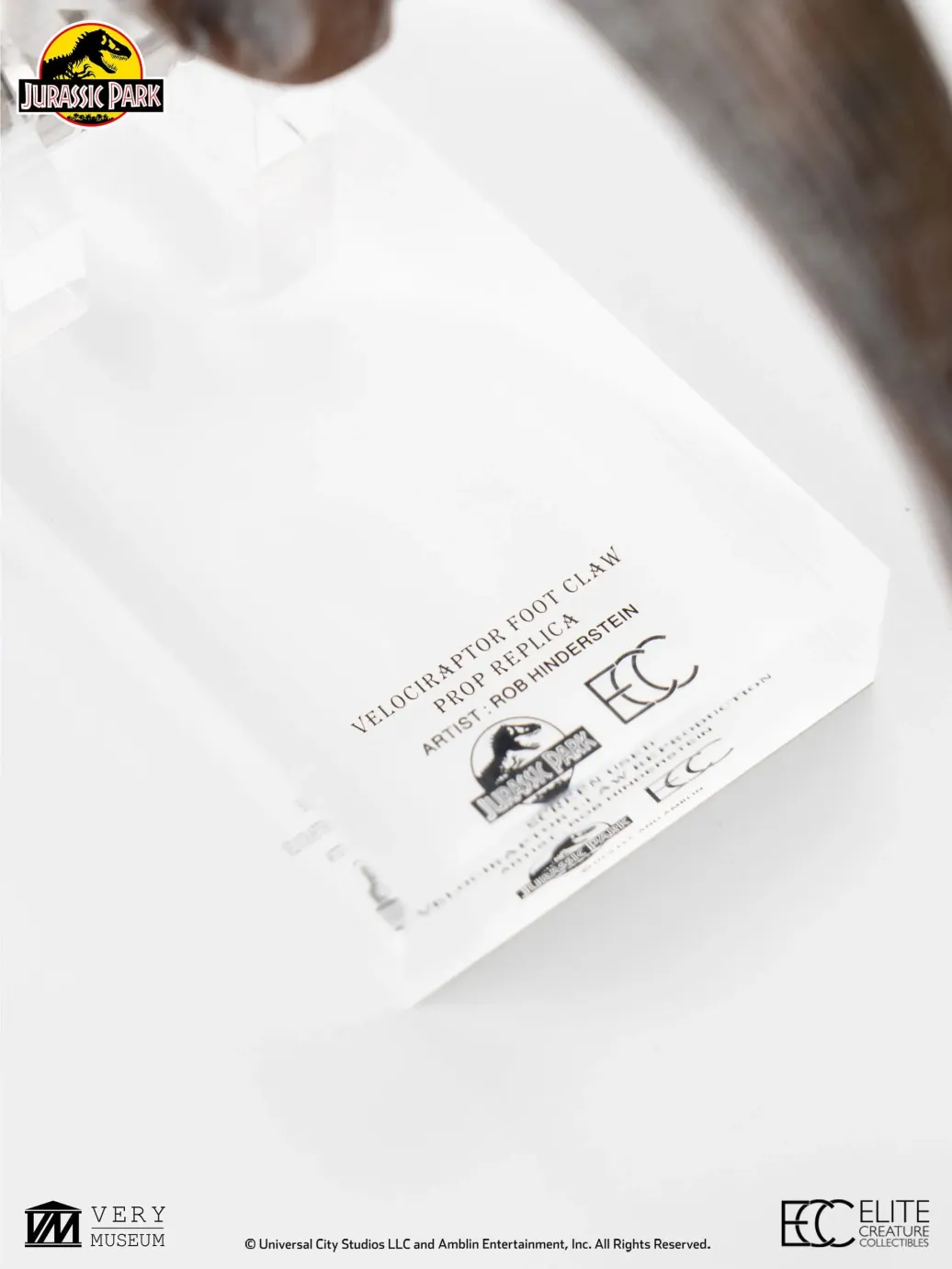 Eine Kralle eines Velociraptor-Requisitenstücks aus Steven Spielbergs Jurassic Park. Ein Velociraptor griff Dr. Ellie Sattler (Laura Dern) an, als sie das Stromnetz im Jurassic Park manuell wieder aufladen wollte.