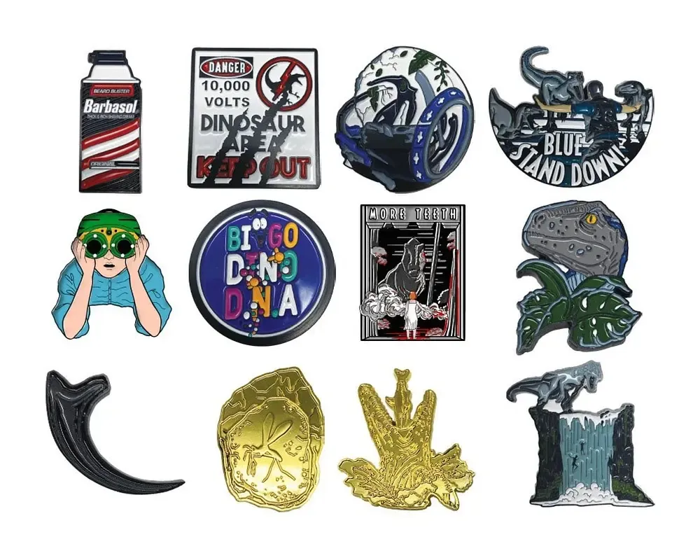 Display mit 12 offiziell lizenzierten Jurassic Park / Jurassic World Ansteck-Pins aus Metall (Zinklegierung). Jeder Button ist einzeln in einer Blindbox verpackt. Jedes Display enthält einen goldenen Pin.