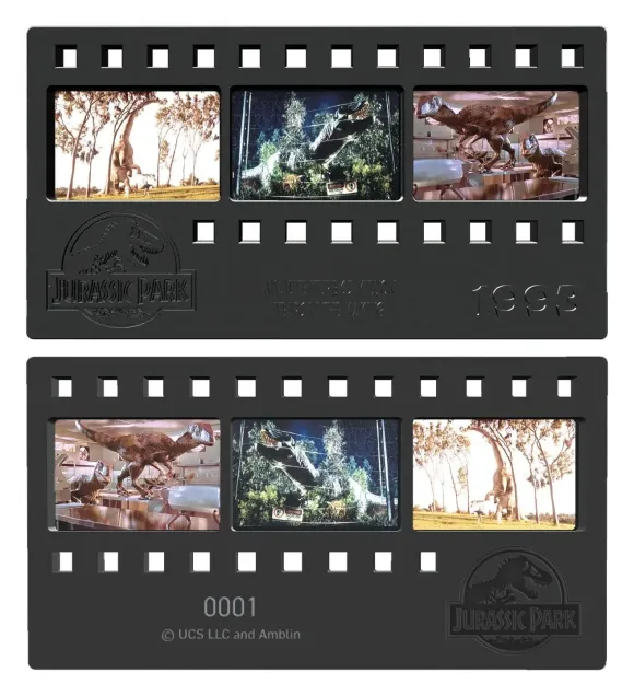 Diese limitierte Metallfilmstreifen-Replik zeigt drei der ikonischsten Szenen aus einem der ikonischsten Filme aller Zeiten: den Brachiosaurus, der auf seinen Hinterbeinen steht, um die hohen Blätter zu erreichen, Dr. Grant, der die Fackel schwenkt, um den T-Rex von den im umgestürzten Jeep gefangenen Kindern abzulenken, und Tim, der sich in der Küche vor den jagenden Raptoren versteckt. Als eines von 5.000 Exemplaren weltweit auf der Rückseite einzeln nummeriert, wird der Barren mit einem Display-Ständer geliefert und ist mit einer schwarz gefärbten Beschichtung versehen.