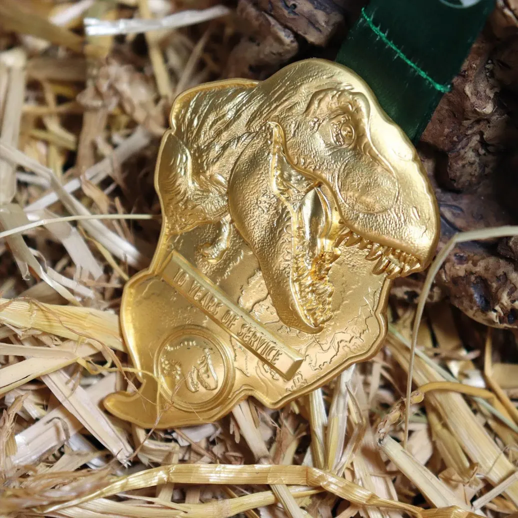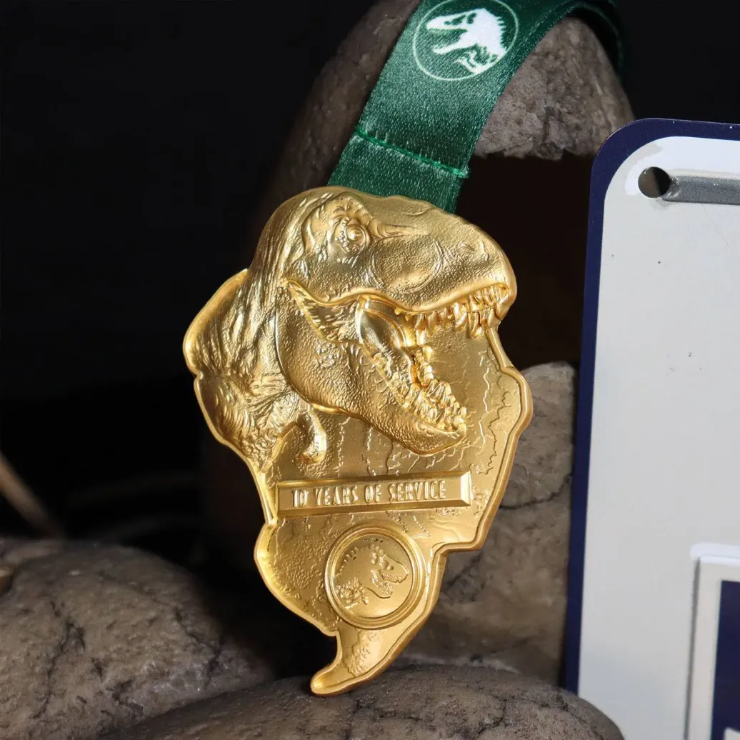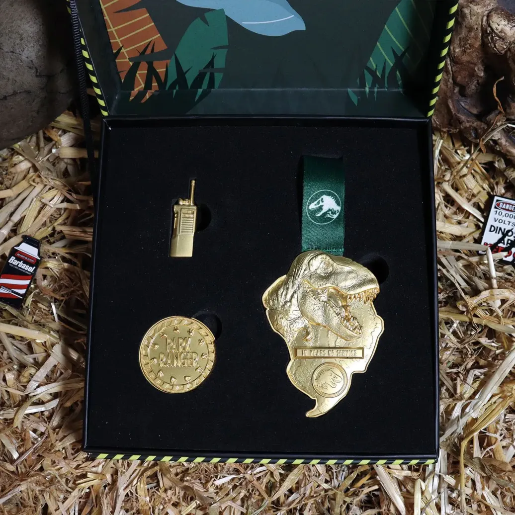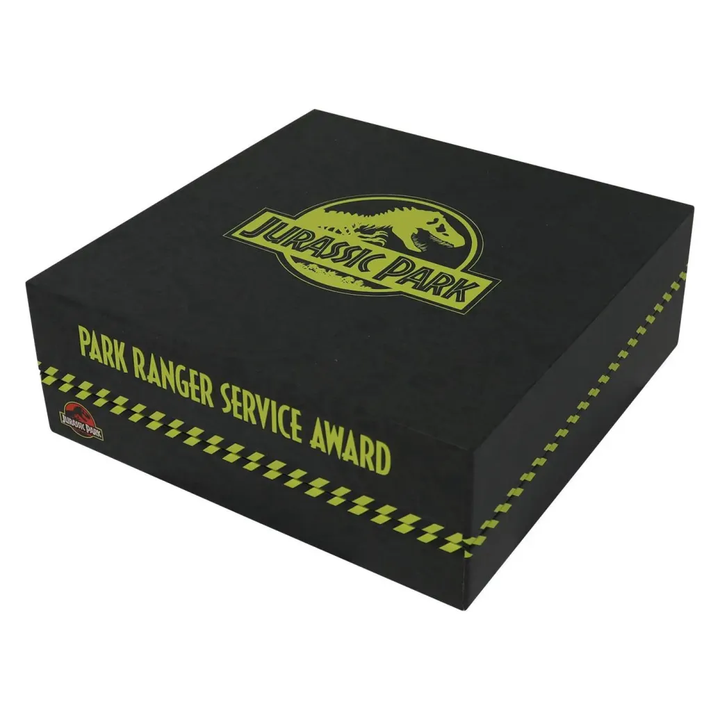 Aus dem Jurassic Park-Universum kommt diese Box mit originalgetreuen Nachbildungen, gefertigt aus versilbertem und vergoldetem Metall. Die Repliken werden in einer bedruckten Box geliefert.