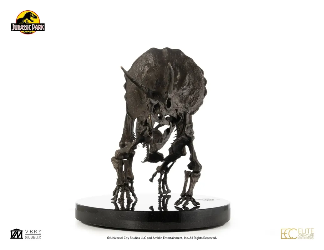 Elite Creature Collectibles ist stolz darauf, das Triceratops-Fossil-Skelett im Maßstab 1:12 aus Bronze vorstellen zu dürfen. Dank seines direkten Zugangs zu den Fossiliensammlungen des Museums hat der renommierte ILM-Künstler Bitan das Triceratops-Skelett originalgetreu nachgebildet, wobei er sich nicht nur auf echte Fossilien als Vorlage stützte, sondern auch die anatomische Gestaltung aus dem Film präzise nachbildete.