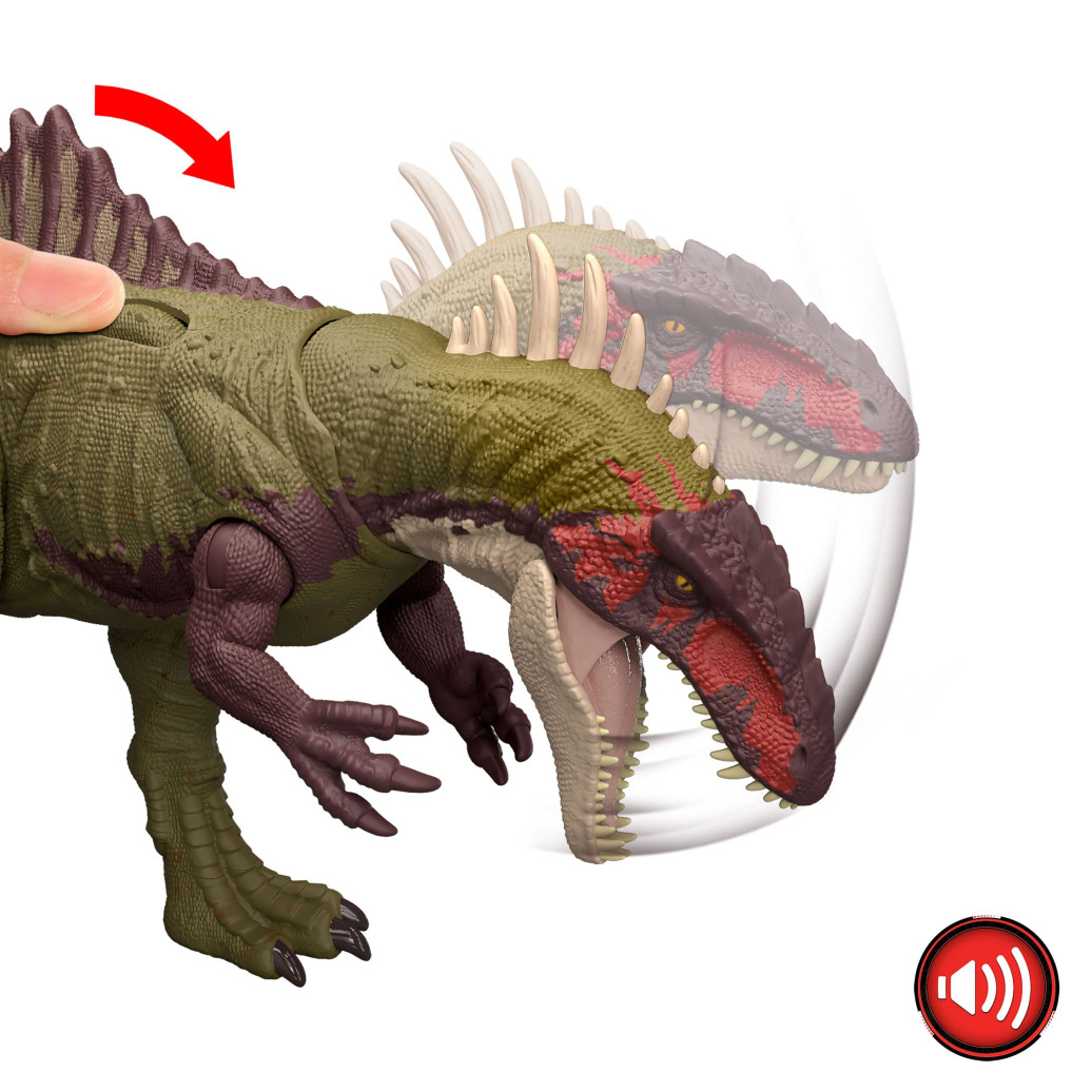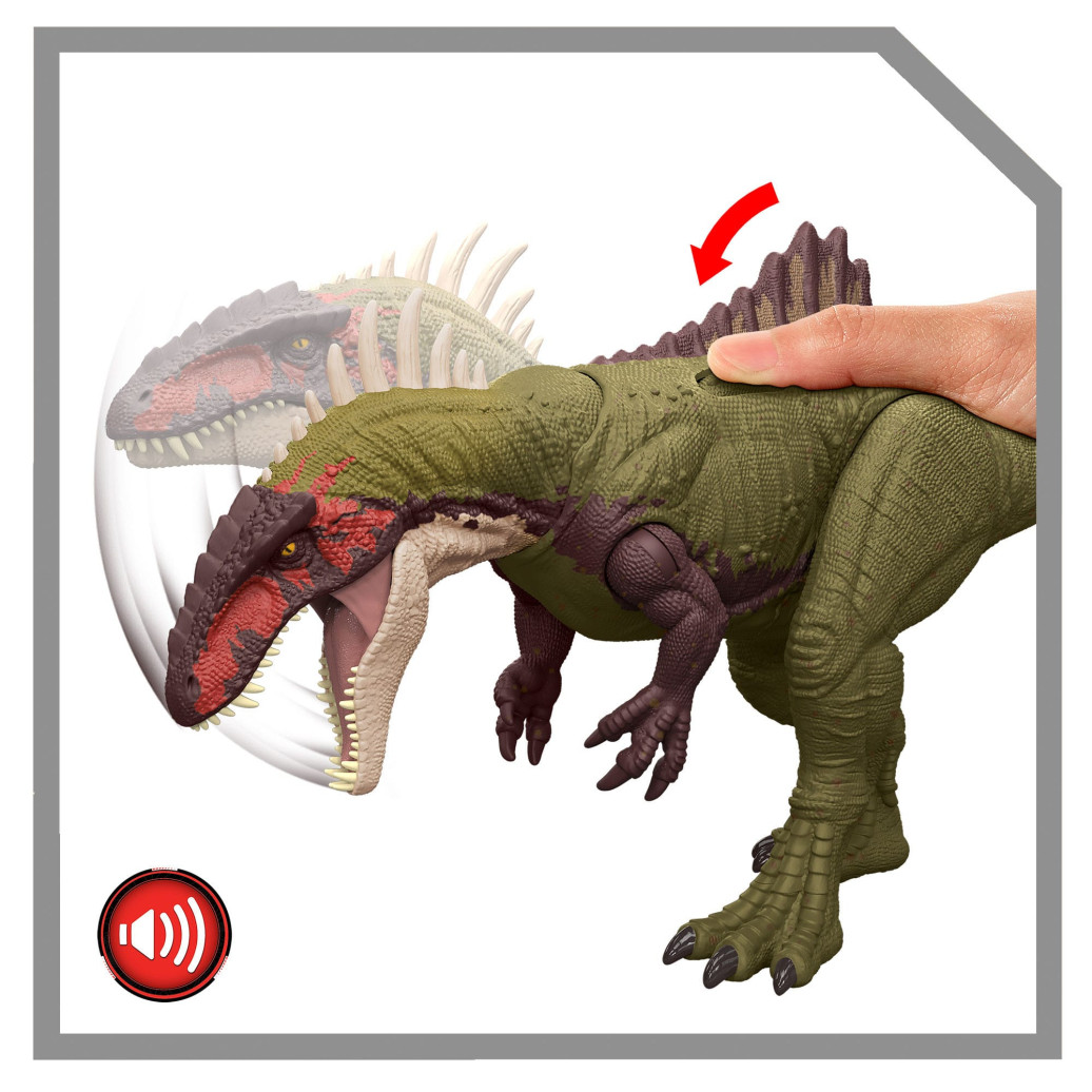 Diese Figur eines Kampfaction Becklespinax im großen Maßstab, eines legendären Dinosauriers aus Jurassic World: Die Chaostheorie", repräsentiert die Spezies mit seinem markanten Rückensegel, grellen Design sowie zahlreichen Sound- und Actionfunktionen. Eine Vorwärtsbewegung des Drehrads aktiviert eine für den Becklespinax typische kontinuierliche, lebensechte Bewegung: einen nach unten gerichteten Kopfstoß samt Beißbewegungen und knurrenden Geräuschen! Beim Zurückdrehen bäumt sich der Kopf mit Brüllgeräuschen auf und die speziell für den Kampf entwickelte Funktion wird aktiviert die ausgefahrenen Schwanzstacheln! Den verborgenen Track-Code in der kostenlosen Jurassic World Play-App auf einem kompatiblen Smartgerät einscannen (Android oder iOS, nicht im Lieferumfang enthalten), um eine digitale Version des Dinosauriers zu aktivieren und Zugang zu coolen Spielen zu erhalten! Abweichungen in Farbe und Gestaltung vorbehalten. Abweichungen in Farbe und Gestaltung vorbehalten.