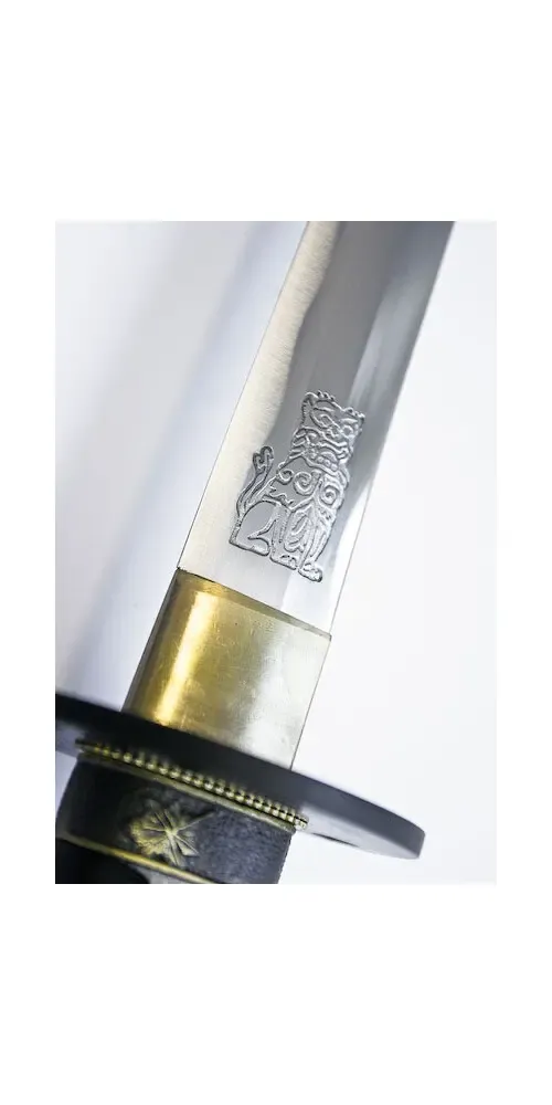 Die Montierungen sind aus geschwaerztem Eisen und zeigen Blütenmotive auf. Die Klinge besteht aus hochwertigem Kohlenstoffstahl mit einer angedeuteten Haertelinie. Kurz hinter der Habaki befindet sich der Hanzoloewe als Gravur auf der Klinge.