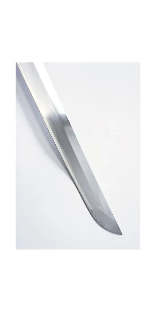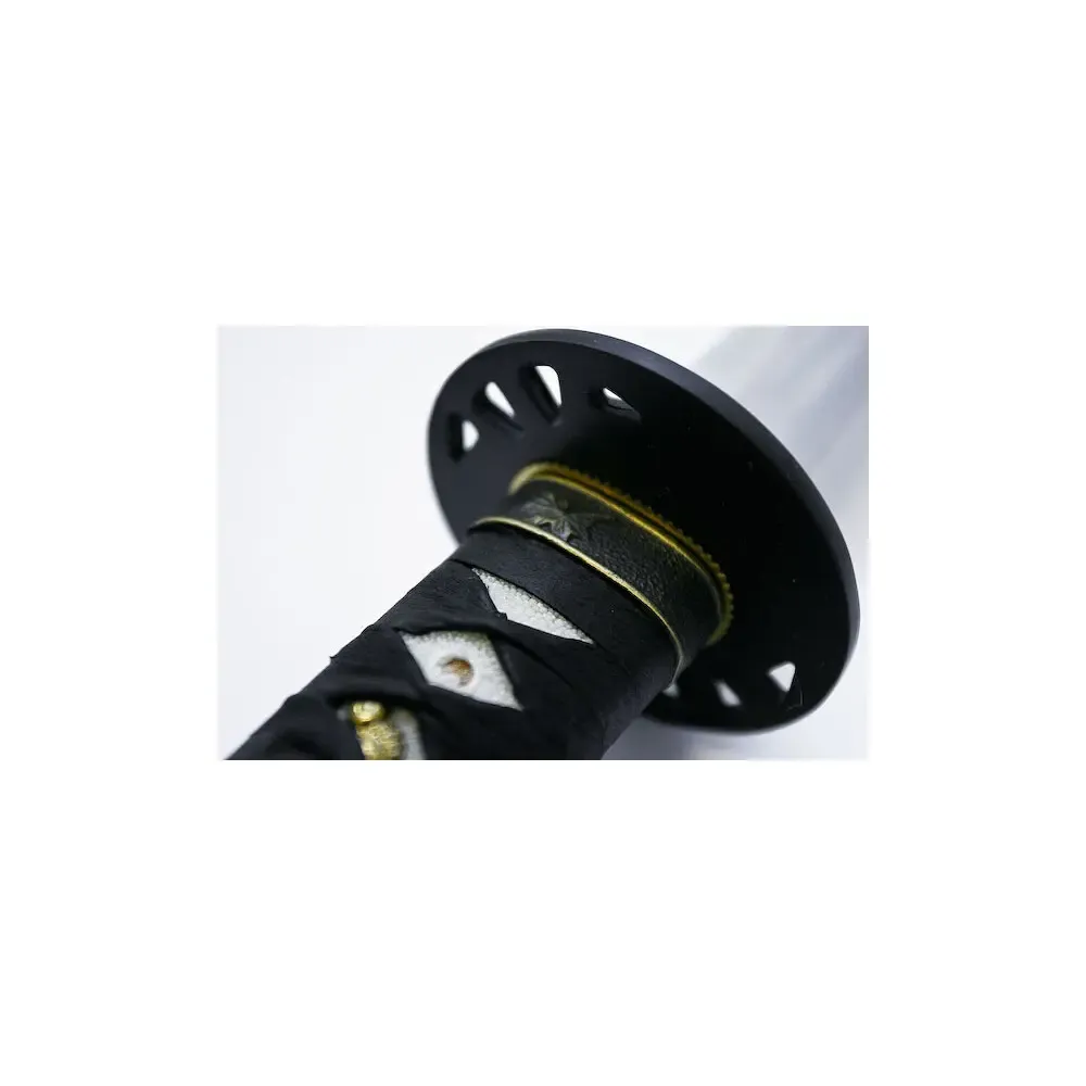 Die Klinge wurde rasiermesserscharf poliert, so dass einem Schnittest mit einem echten Hanzo Schwert nun nichts mehr im Weg steht. Die Klinge wird im Griff durch 2 Mekugi gehalten. Der Griff wurde mit einem Leder umwickelt und unter der Wicklung befinden sich 2 sehr schoene Menuki.