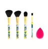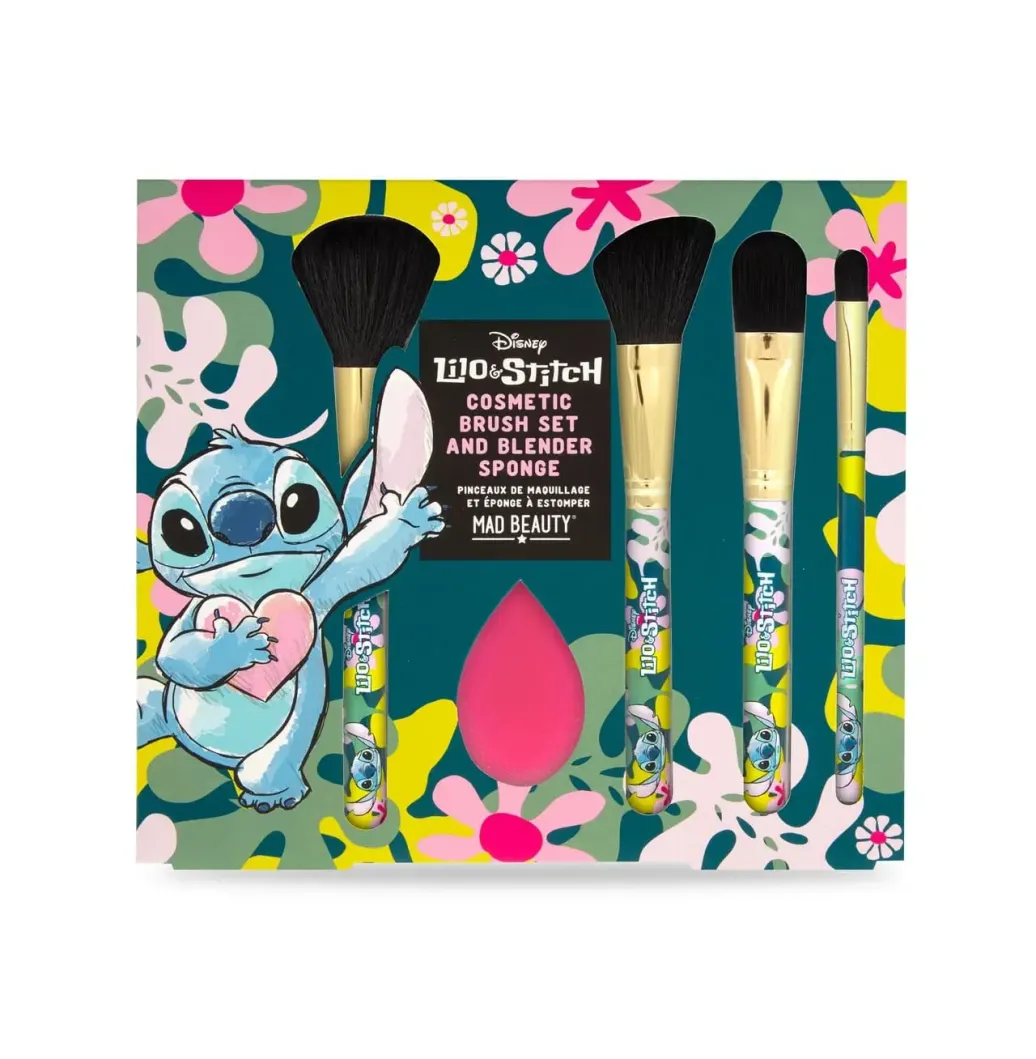 Enthält einen Make-up-Schwamm und eine Reihe von vier Pinseln in verschiedenen Größen zum Erröten, Schattieren und Definieren. Alle haben einen Griff mit tropischem Stitch-Print und goldene Details. Offiziell lizenziert.