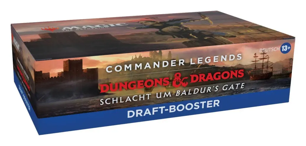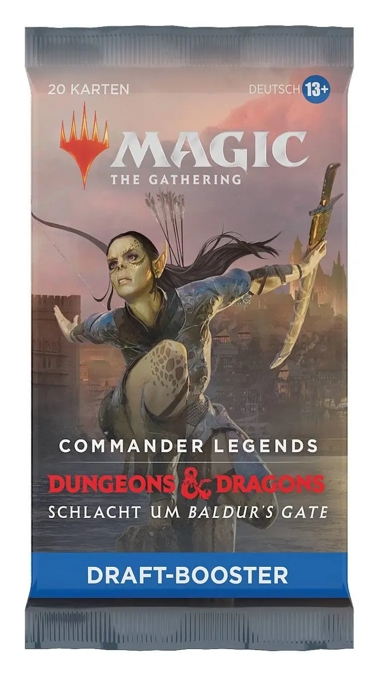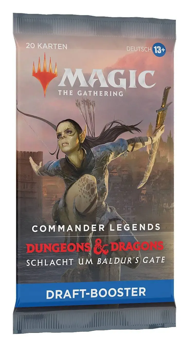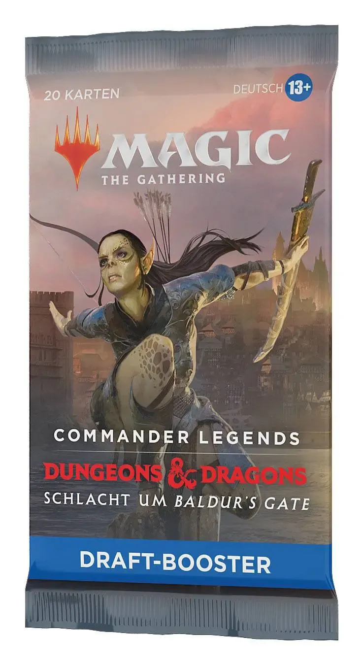 Drafte ein Commander-Deck in der Welt von Dungeons & Dragons. Jeder Commander Legends: Schlacht um Baldur's Gate Draft-Booster enthält 20 Magic-Karten und 1 Spielstein-/Werbekarte in einer Kombination aus 1-4 Karten der Seltenheit selten oder höher (2: 37 %. 3: 6 %. 4: < 1 %), 3-6 nicht ganz so häufigen und 13-15 häufigen Karten. 1 Karte beliebiger Seltenheit ist eine traditionelle Foilkarte. Sagenhaft seltener Foil-Planeswalker ohne Rand in < 1 % der Booster.