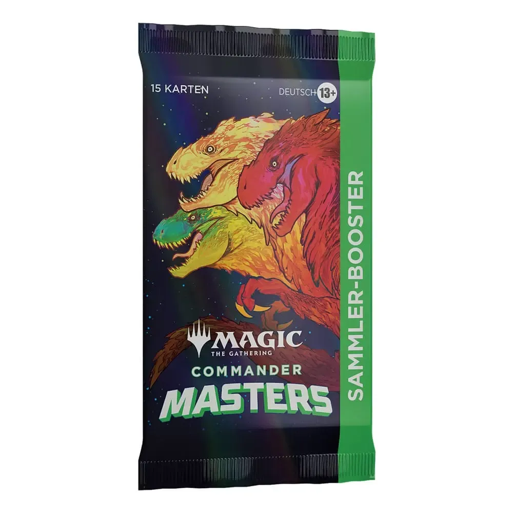 Ein Commander Masters Sammler-Booster-Display enthält 4 Commander Masters Sammler-Booster. Jeder Sammler-Booster enthält 15 Magic: The Gathering Karten und 1 doppelseitige Foil-Spielsteinkarte, darunter eine Kombination aus 5 Karten der Seltenheit selten oder höher, 2-5 nicht ganz so häufigen Karten, 4-7 häufigen Karten und 1 Länderkarte.