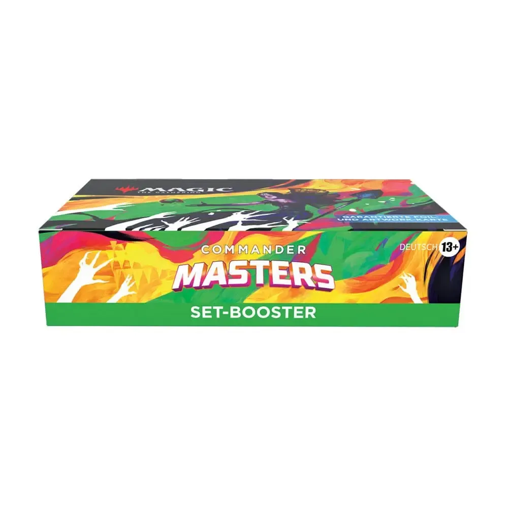 Dieses Commander Masters Set-Booster-Display enthält 24 Commander Masters Set-Booster. Jeder Set-Booster enthält 15 Magic-Karten, 1 Artwork-Karte und 1 Spielstein-/Werbekarte oder Karte aus "der Liste" (eine besondere Karte aus der Geschichte von Magic - in 25 % der Booster), darunter 2-6 Karten der Seltenheit selten oder höher (2: 34 %. 3: 48 %, 4: 15 %, 5: 2 %, 6: < 1 %), 3-8 nicht ganz so häufige, 4-8 häufige und 1 Länderkarte. Jeder Booster enthält mindestens 1 traditionelle Foilkarte beliebiger Seltenheit. In 20 % der Set-Booster ersetzt ein traditionelles Foil-Land das Standardland, und in 10 % der Set-Booster ist statt der Artwork-Karte eine Signatur-Artwork-Karte mit Foil-Stempel enthalten. In 1 % der Booster ist eine sagenhaft seltene Karte als traditionelle Foilkarte ohne Rand enthalten.