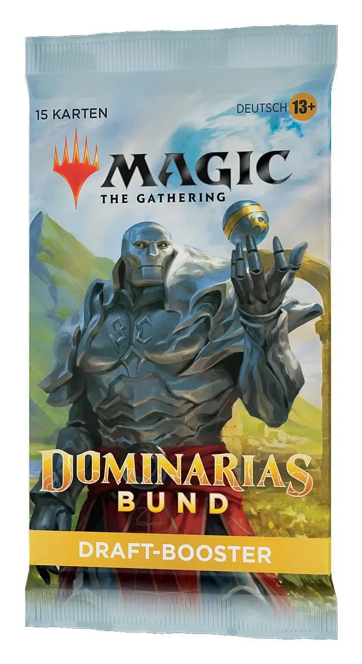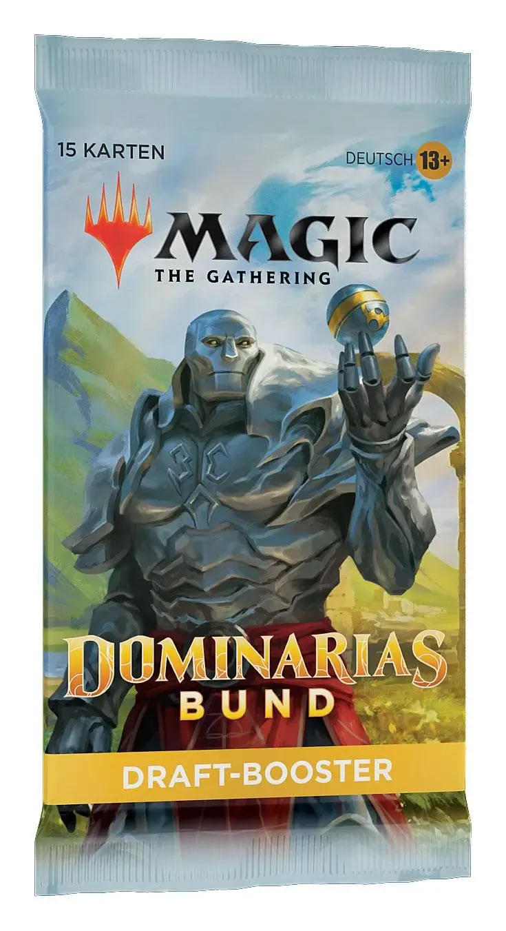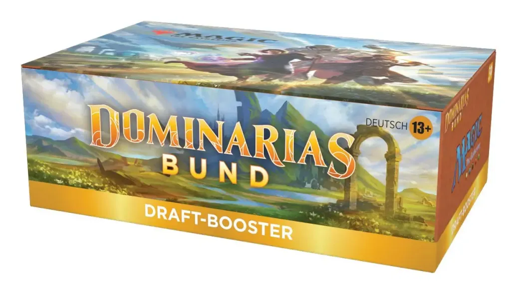 Ein Dominarias Bund Draft-Booster-Display enthält 36 Dominarias Bund Draft-Booster und 1 traditionelle Box-Topper-Foilkarte. Jeder Dominarias Bund Draft-Booster enthält 15 Karten und 1 Spielsteinkarte oder Werbekarte, darunter eine Kombination aus 1 Karte der Seltenheit selten oder höher, 3 nicht ganz so häufigen Karten, 10 häufigen Karten und 1 Länderkarte. Traditioneller sagenhaft seltener Foil-Planeswalker ohne Rand in < 1 % der Booster. In 33 % der Booster ersetzt eine traditionelle Foilkarte zufälliger Seltenheit eine häufige Karte.