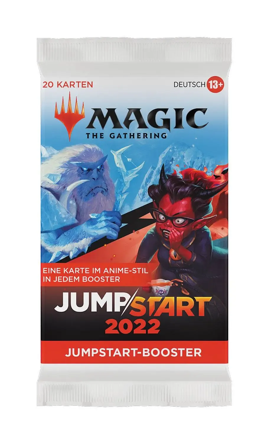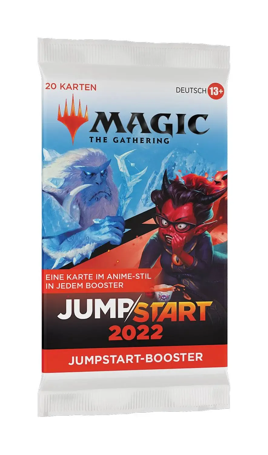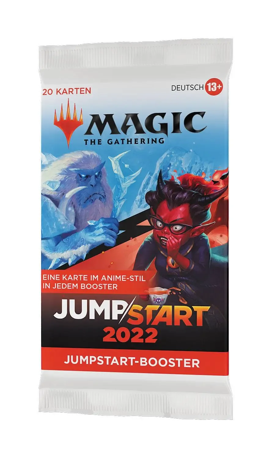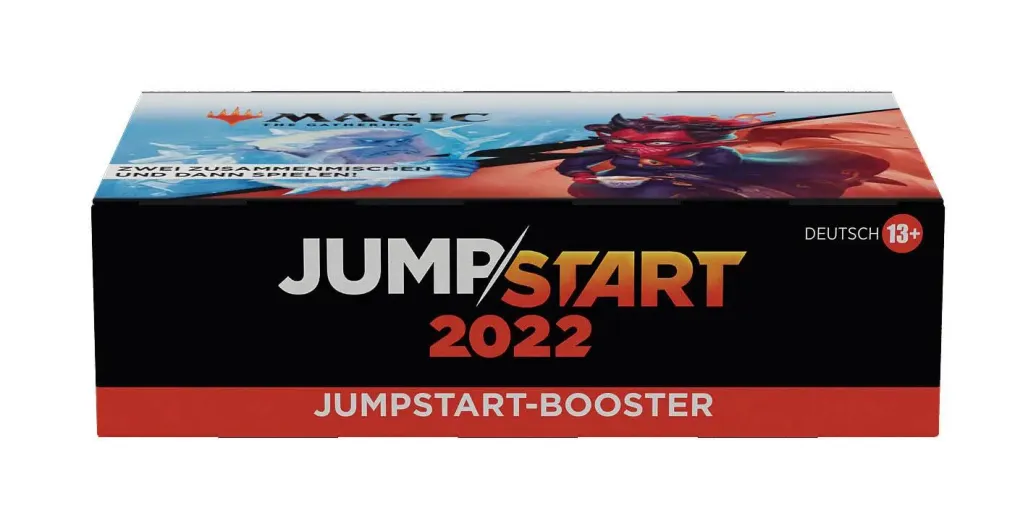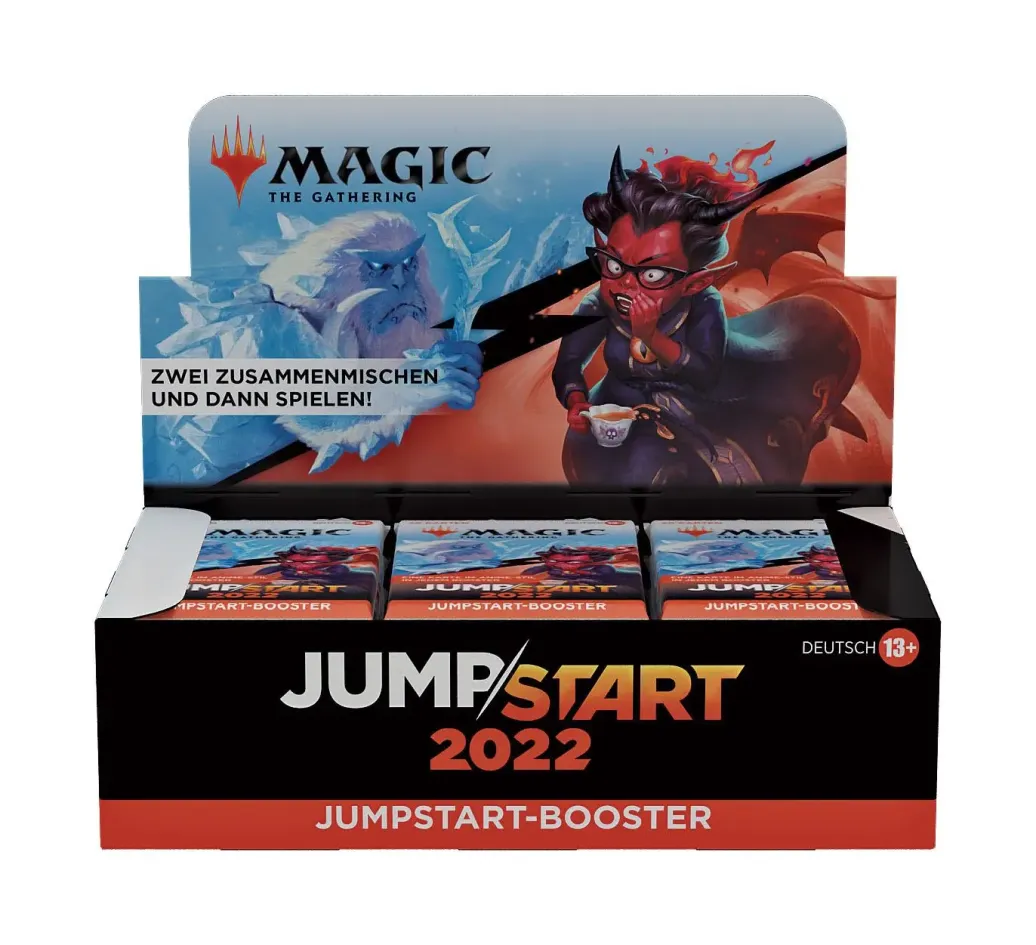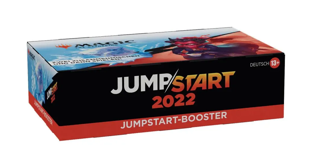 Ein Jumpstart 2022 Booster-Display enthält 24 Magic: The Gathering Jumpstart-Booster. Jeder Jumpstart 2022 Booster enthält 1 Beilage, die das Thema des Boosters anzeigt, und 20 Magic-Karten, die sich um dieses Thema drehen, darunter 1 Karte mit von Anime inspirierter Illustration, insgesamt 1-2 Karten der Seltenheit selten oder höher und alle zum Spielen benötigten Länder. Um mit noch wilderen Themenkombinationen zu spielen, können die Jumpstart 2022 Booster mit Packungen aus anderen Jumpstart-Produkten kombiniert werden.