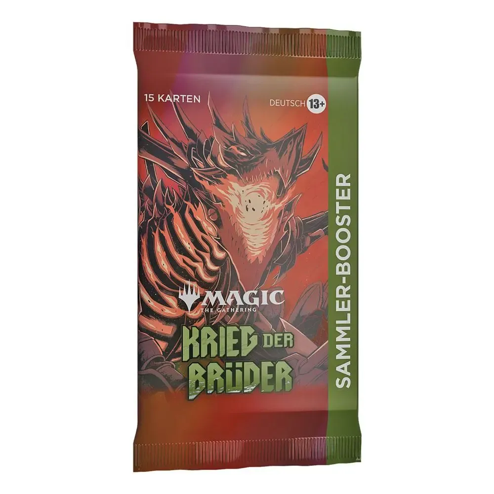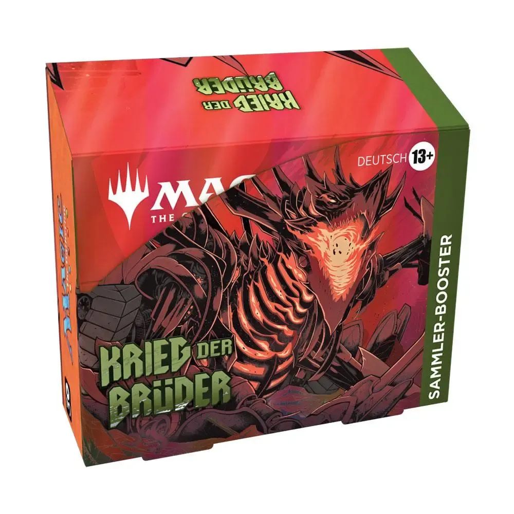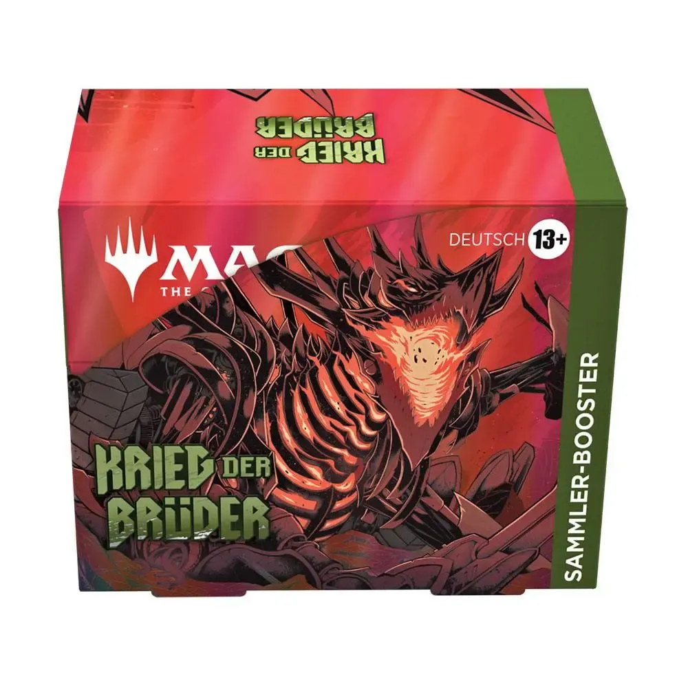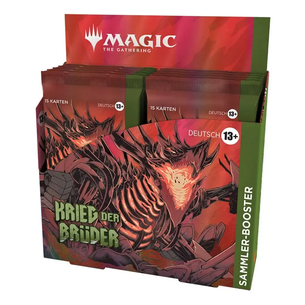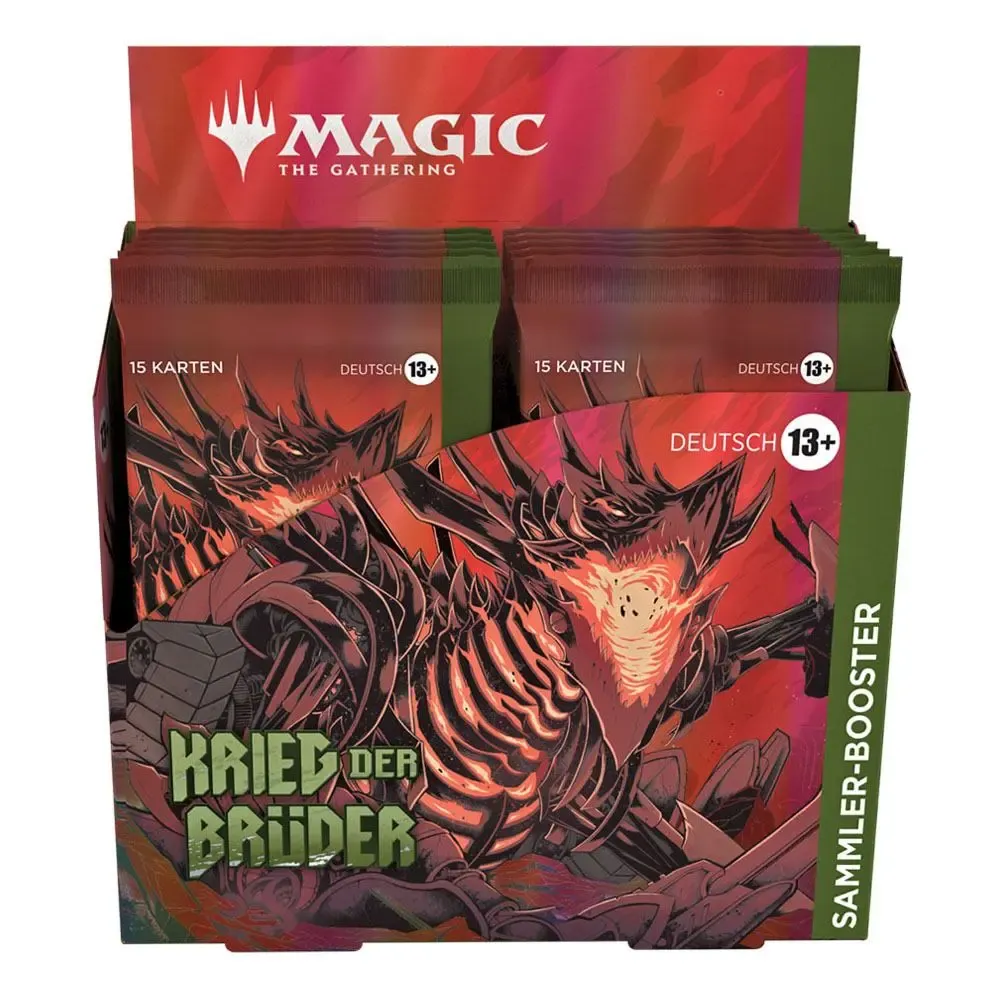Ein Krieg der Brüder Sammler-Booster-Display enthält 12 Krieg der Brüder Sammler-Booster. Jeder Sammler-Booster enthält 15 Magic: The Gathering Karten und 1 doppelseitige Foil-Spielsteinkarte, darunter eine Kombination aus 1 besonderen sagenhaft seltenen Karte, 5 Karten der Seltenheit selten oder höher, 4 nicht ganz so häufigen Karten, 4 häufigen Karten und 1 Länderkarte. Jeder Booster enthält insgesamt 10-11 traditionelle Foilkarten.