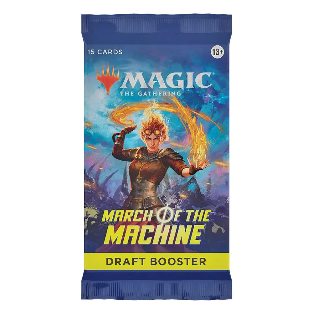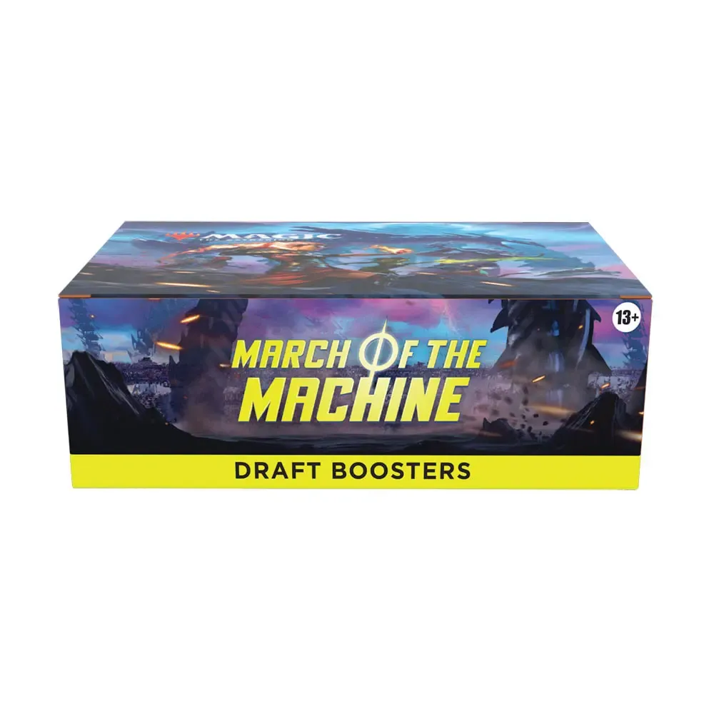Das Marsch der Maschine Draft-Booster-Display enthält 36 Marsch der Maschine Draft-Booster. Jeder Draft-Booster enthält 15 Karten und 1 Spielstein-/Werbekarte oder Hilfekarte, darunter 1-2 Karten der Seltenheit selten oder höher, 3-5 nicht ganz so häufige Karten, 8-9 häufige Karten und 1 Länderkarte. Traditioneller sagenhaft seltener Foil-Planeswalker ohne Rand in < 1 % der Booster. In 33 % der Booster ersetzt eine traditionelle Foilkarte zufälliger Seltenheit eine häufige Karte.