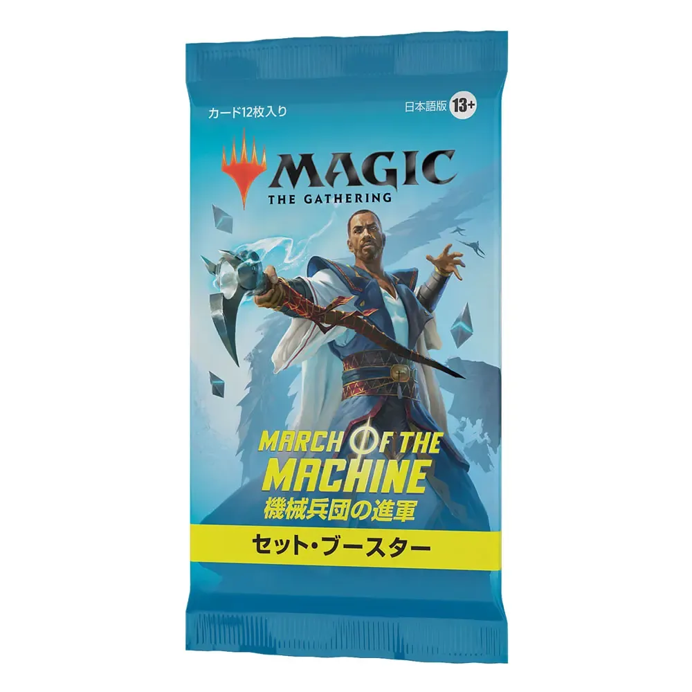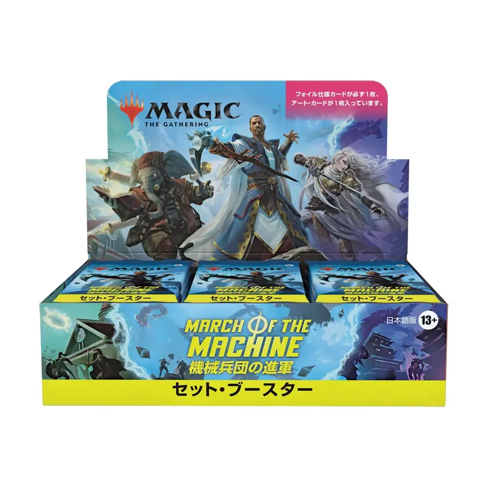 Das Marsch der Maschine Set-Booster-Display enthält 30 Marsch der Maschine Set-Booster. Jeder Set-Booster enthält 12 Magic-Karten, 1 Artwork-Karte und 1 Spielstein-/Werbekarte, Hilfekarte oder Karte aus "der Liste" (eine besondere Karte aus der Geschichte von Magic - in 25 % der Booster).