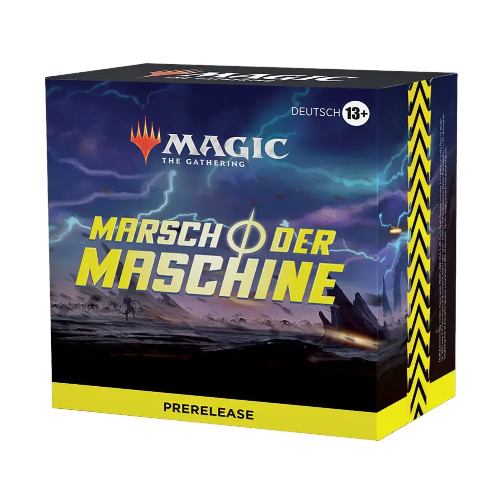 Das Marsch der Maschine Prerelease-Pack enthält 6 Marsch der Maschine Draft-Booster, 1 seltene oder sagenhaft seltene traditionelle Foilkarte mit Datumsstempel, 1 neue sagenhaft seltene Karte (in 18 % der Prerelease-Packs als traditionelle Foilkarte), 1 Code-Karte zum Freischalten von 6 Marsch der Maschine Boostern in Magic: The Gathering Arena (nur in ausgewählten Regionen verfügbar), 1 Deckbox und 1 Spindown-Lebenspunktezähler.