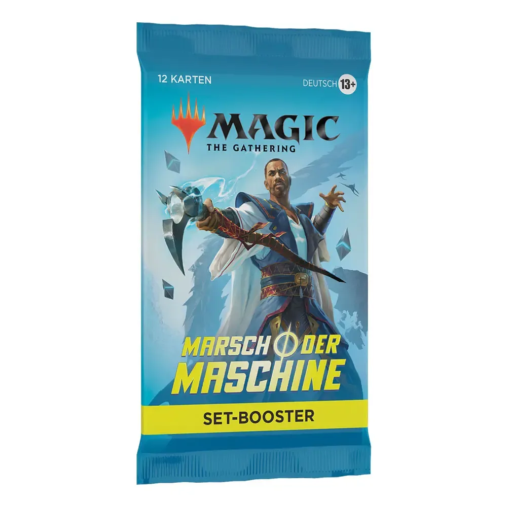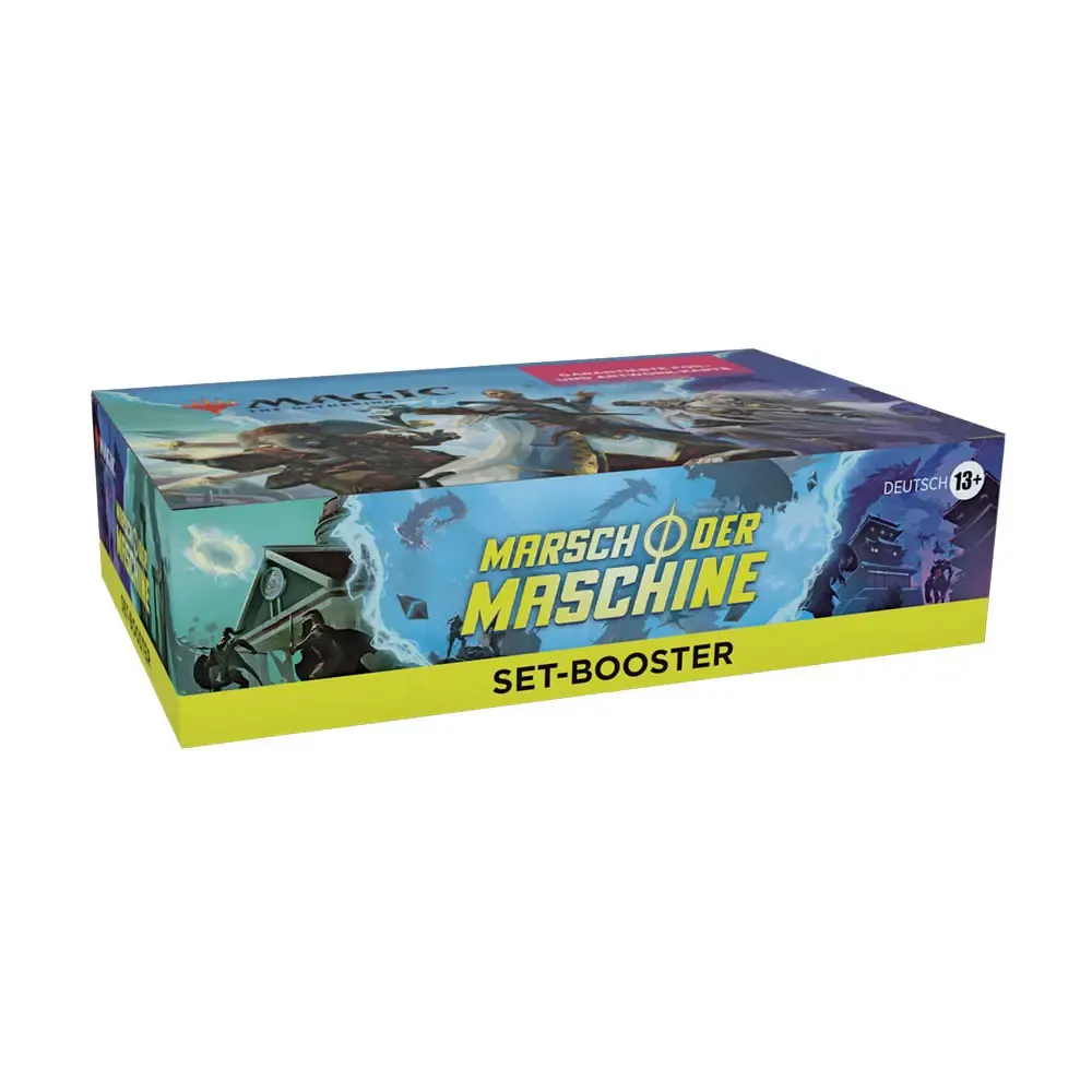 Das Marsch der Maschine Set-Booster-Display enthält 30 Marsch der Maschine Set-Booster. Jeder Set-Booster enthält 12 Magic-Karten, 1 Artwork-Karte und 1 Spielstein-/Werbekarte, Hilfekarte oder Karte aus "der Liste" (eine besondere Karte aus der Geschichte von Magic - in 25 % der Booster).
