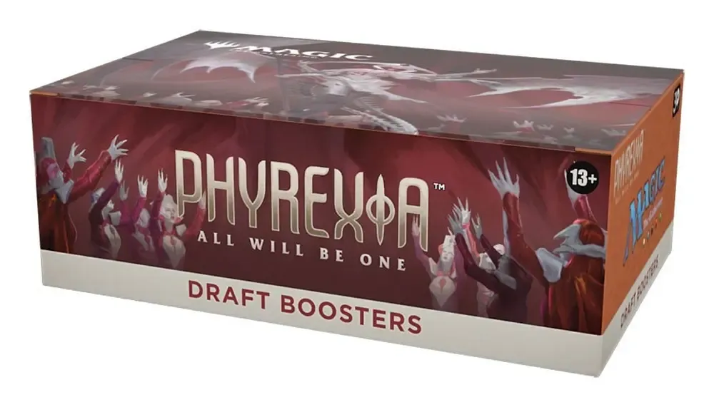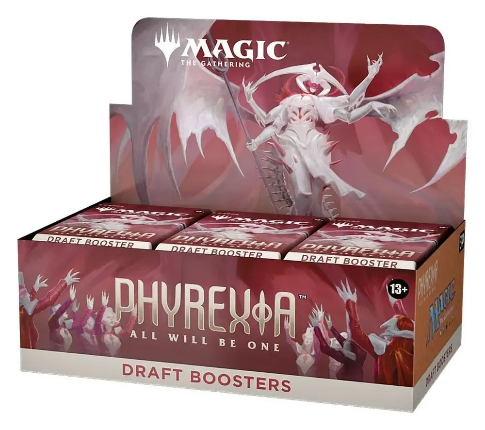 Ein Phyrexia: Alles wird eins Draft-Booster-Display enthält 36 Phyrexia: Alles wird eins Draft-Booster. Jeder Draft-Booster enthält 15 Karten und 1 Spielstein-/Werbekarte, darunter 1 Karte der Seltenheit selten oder höher, 3 nicht ganz so häufige Karten, 10 häufige Karten und 1 Länderkarte. Traditioneller sagenhaft seltener Foil-Planeswalker ohne Rand in < 1 % der Booster. In 33 % der Booster ersetzt eine traditionelle Foilkarte zufälliger Seltenheit eine häufige Karte.