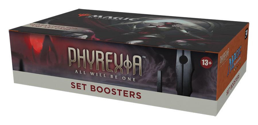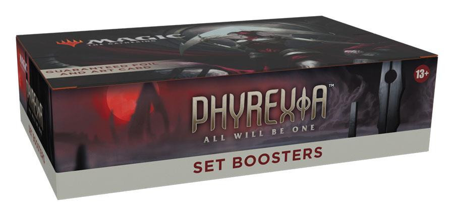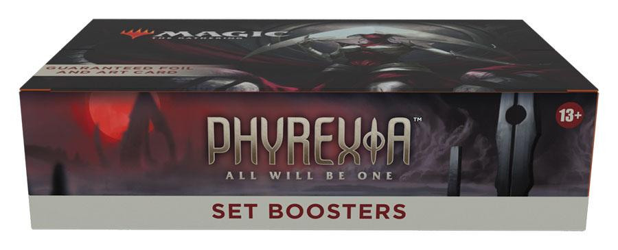 Ein Phyrexia: Alles wird eins Set-Booster-Display enthält 30 Phyrexia: Alles wird eins Set-Booster. Jeder Set-Booster enthält 12 Magic-Karten, 1 Artwork-Karte und 1 Spielstein-/Werbekarte oder Karte aus "der Liste" (eine besondere Karte aus der Geschichte von Magic oder eine Universes Within Karte - in 25 % der Booster).