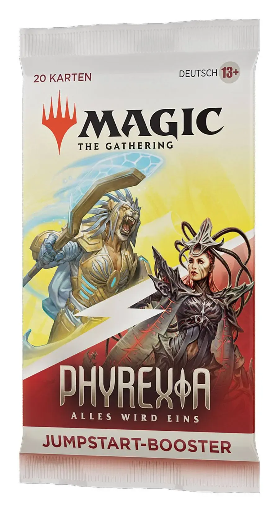Phyrexia: Alles wird eins Jumpstart-Booster enthalten 20 Magic-Karten (darunter alle zum Spielen benötigten Länder). In jedem Booster findest du 2 seltene Karten (1 seltene Karte, die speziell für Jumpstart-Booster entwickelt wurde, und 1 seltene oder sagenhaft seltene Karte aus dem Hauptset) und 2 Länderkarten als funkelnde traditionelle Foilkarten.