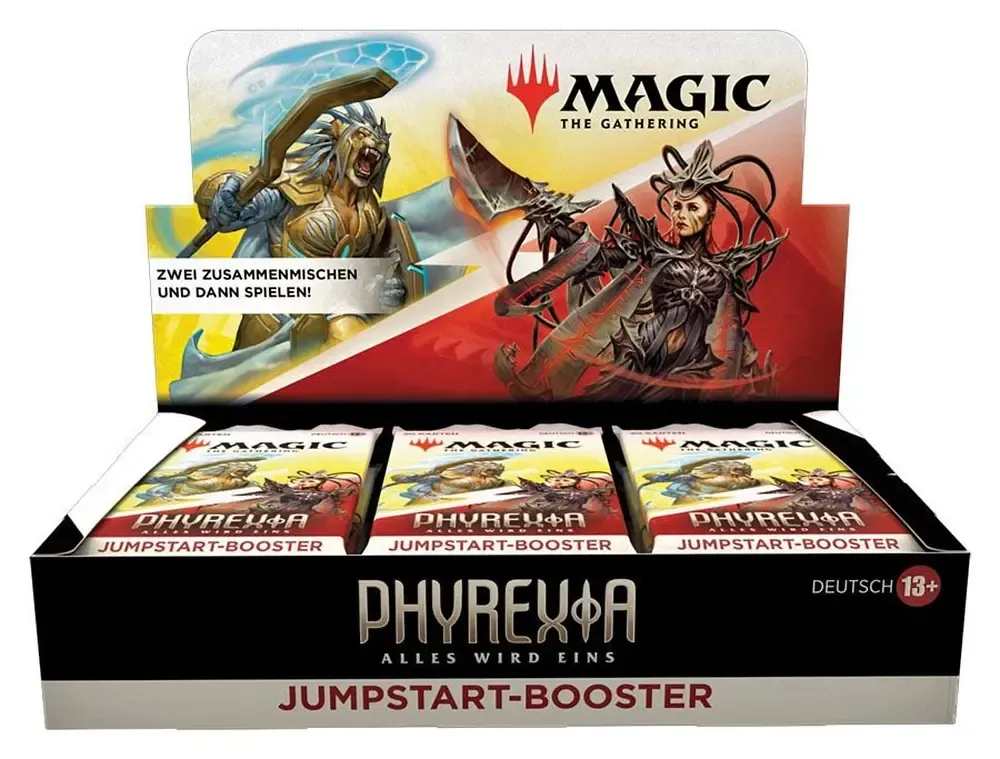 Ein Phyrexia: Alles wird eins Jumpstart-Booster-Display enthält 18 Phyrexia: Alles wird eins Jumpstart-Booster. Jeder Booster hat ein Thema. Schnappe dir einfach zwei Booster und mische sie für wilde Kombinationen und ein einzigartiges Spielerlebnis zusammen. Ideal für eine schnelle Partie, für alteingesessene Fans, die wieder einsteigen möchten, oder für eine spaßige, einfache Weise, das Spiel zu erlernen.