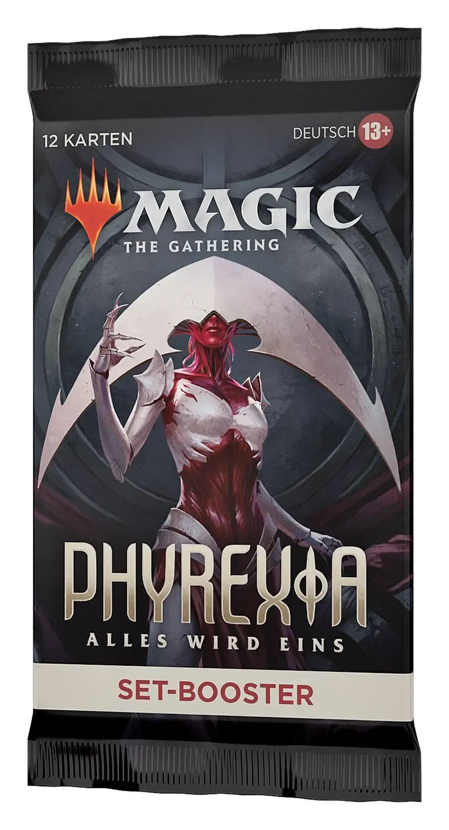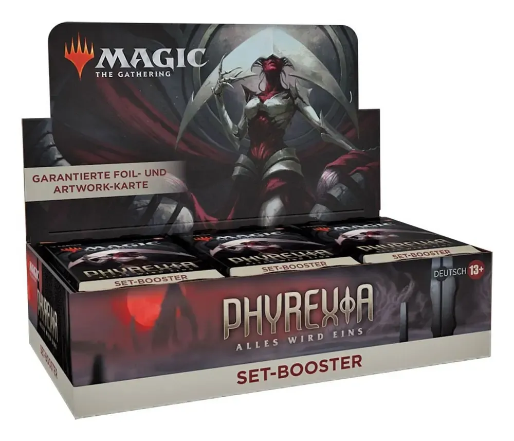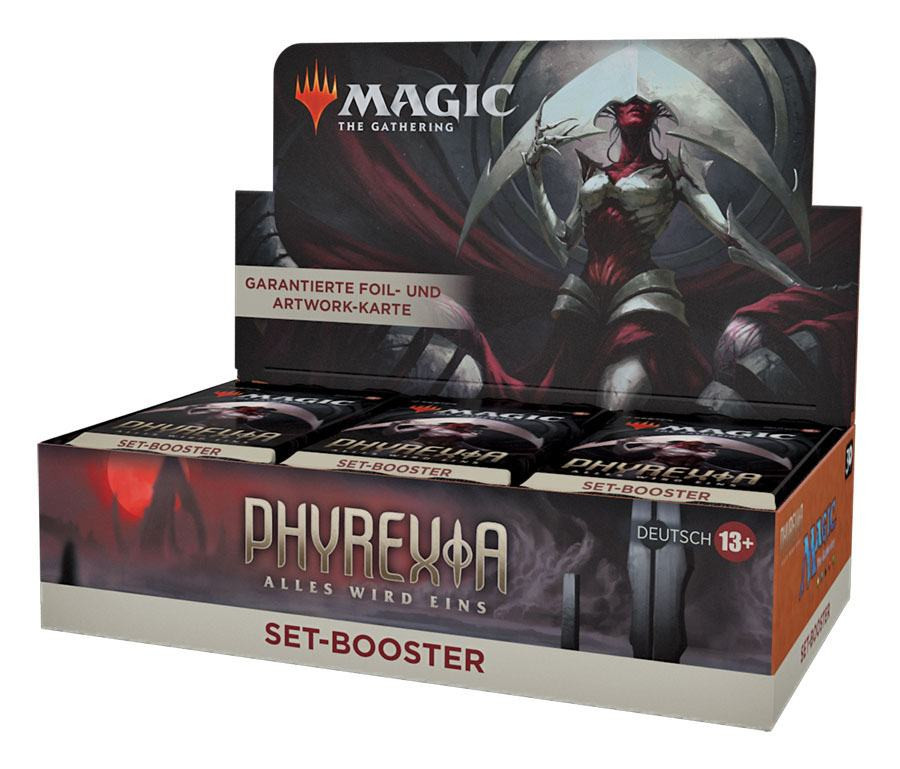 Ein Phyrexia: Alles wird eins Set-Booster-Display enthält 30 Phyrexia: Alles wird eins Set-Booster. Jeder Set-Booster enthält 12 Magic-Karten, 1 Artwork-Karte und 1 Spielstein-/Werbekarte oder Karte aus "der Liste" (eine besondere Karte aus der Geschichte von Magic oder eine Universes Within Karte - in 25 % der Booster).