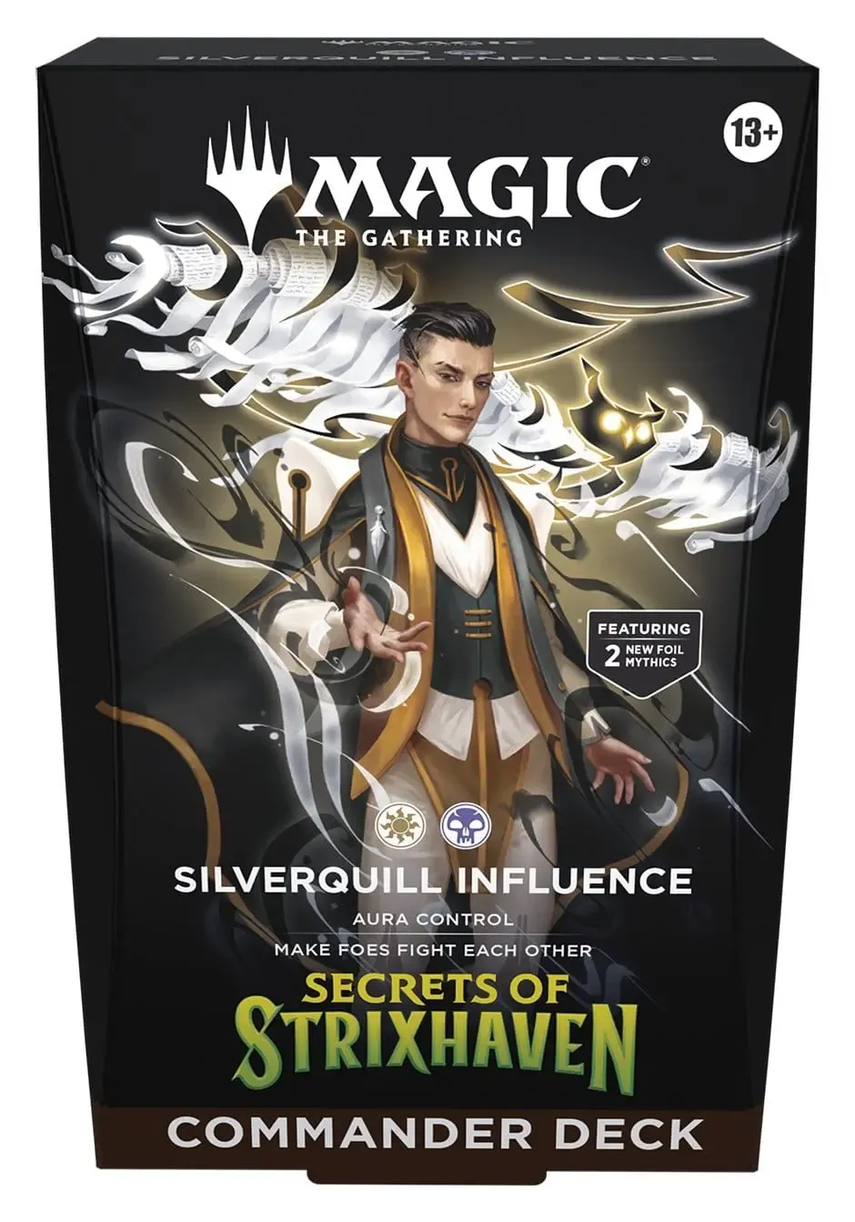 Dieses Bundle enthält alle 5 Magic: The Gathering Secrets of Strixhaven-Decks: Silverquill Influence, Prismari Artistry, Witherbloom Pestilence, Lorehold Spirit, Quandrix Unlimited. Jedes enthält 1 Deck mit 100 Magic-Karten (2 traditionelle Foil-Karten ohne Rand, 98 reguläre Karten), 10 doppelseitige Token-Karten, 1 Deckbox (für 100 Karten mit Hüllen), 1 Strategiehandbuch und 1 Referenzkarte.