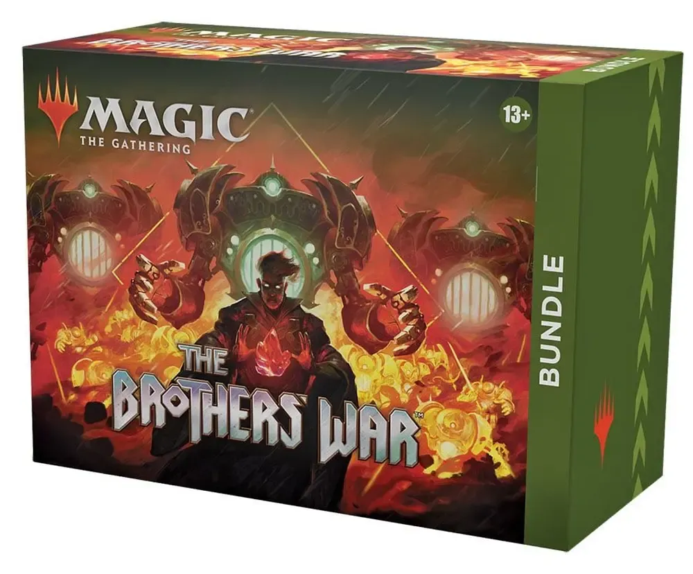 Das Krieg der Brüder Bundle enthält 8 Krieg der Brüder Set-Booster - die besten Booster, wenn man Packungen einfach nur zum Spaß öffnen möchte - plus exklusives Zubehör: 40 Standardländer (20 Foil und 20 Nicht-Foil), 1 traditionelle Foil-Promokarte mit Bundle-exklusiver alternativer Illustration, 1 übergroßer Spindown-Lebenspunktezähler (rot oder grün), 1 Kartenaufbewahrungsschachtel und 2 Regelreferenzkarten.
