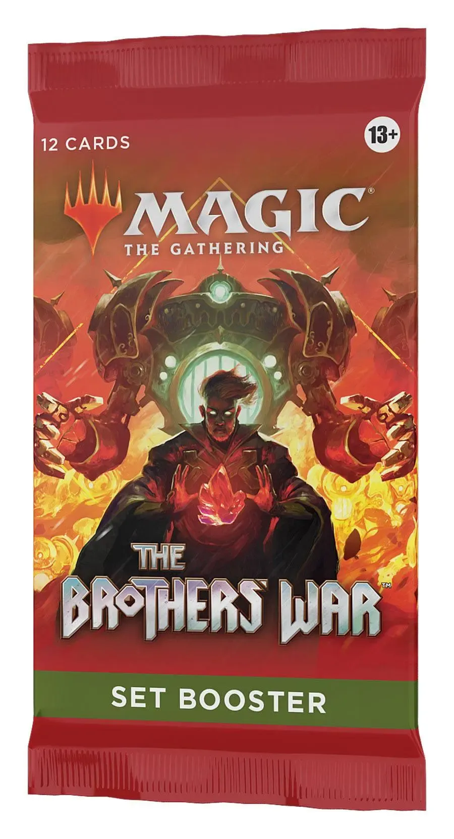 Ein Krieg der Brüder Set-Booster-Display enthält 30 Krieg der Brüder Set-Booster. Jeder Set-Booster enthält 12 Magic-Karten, 1 Artwork-Karte und 1 Spielstein-/Werbekarte oder Karte aus "der Liste" (eine besondere Karte aus der Geschichte von Magic - in 25 % der Booster).