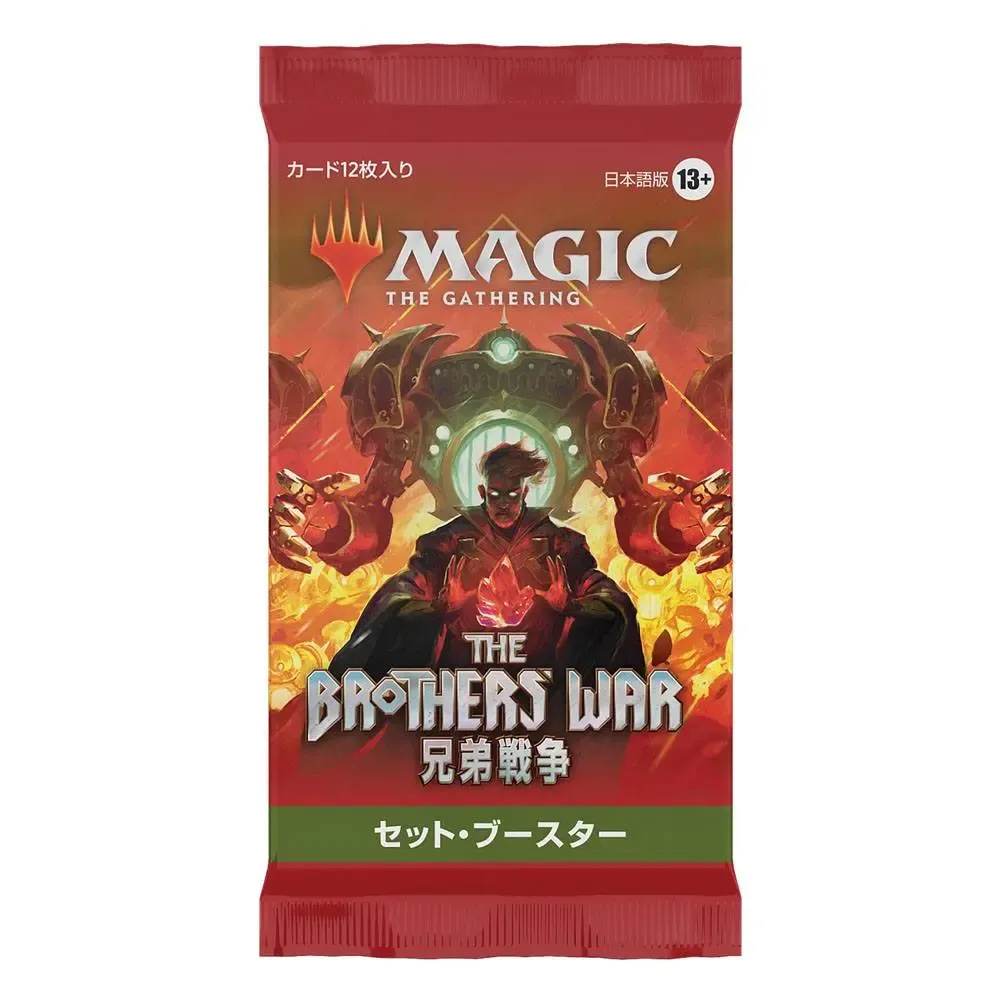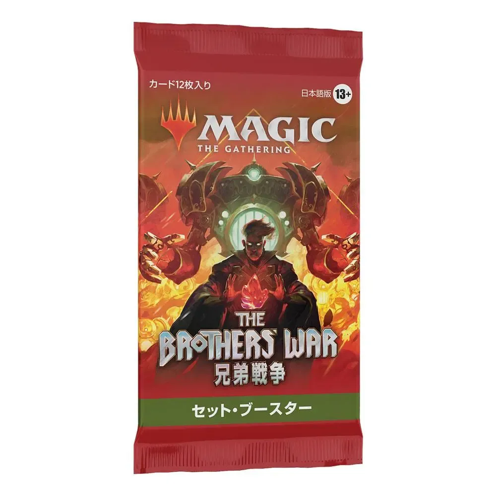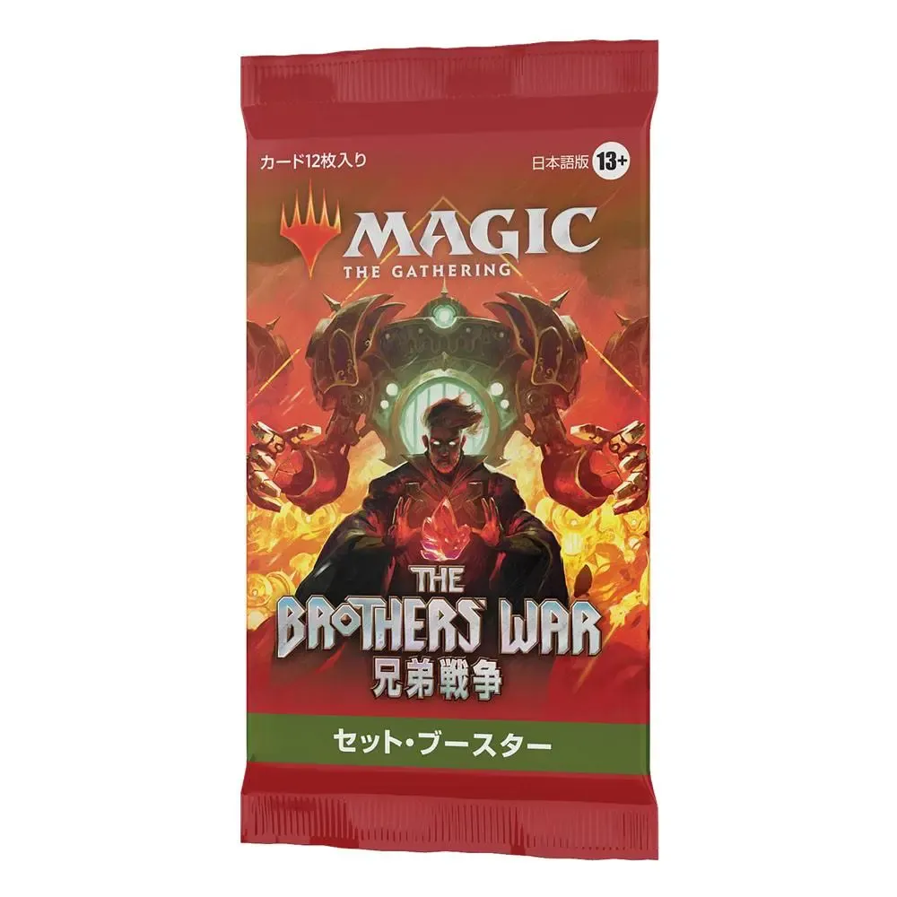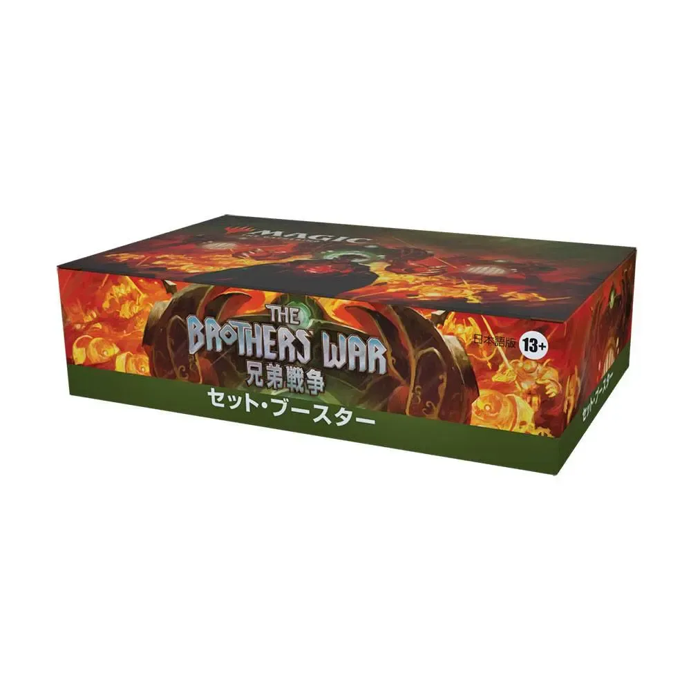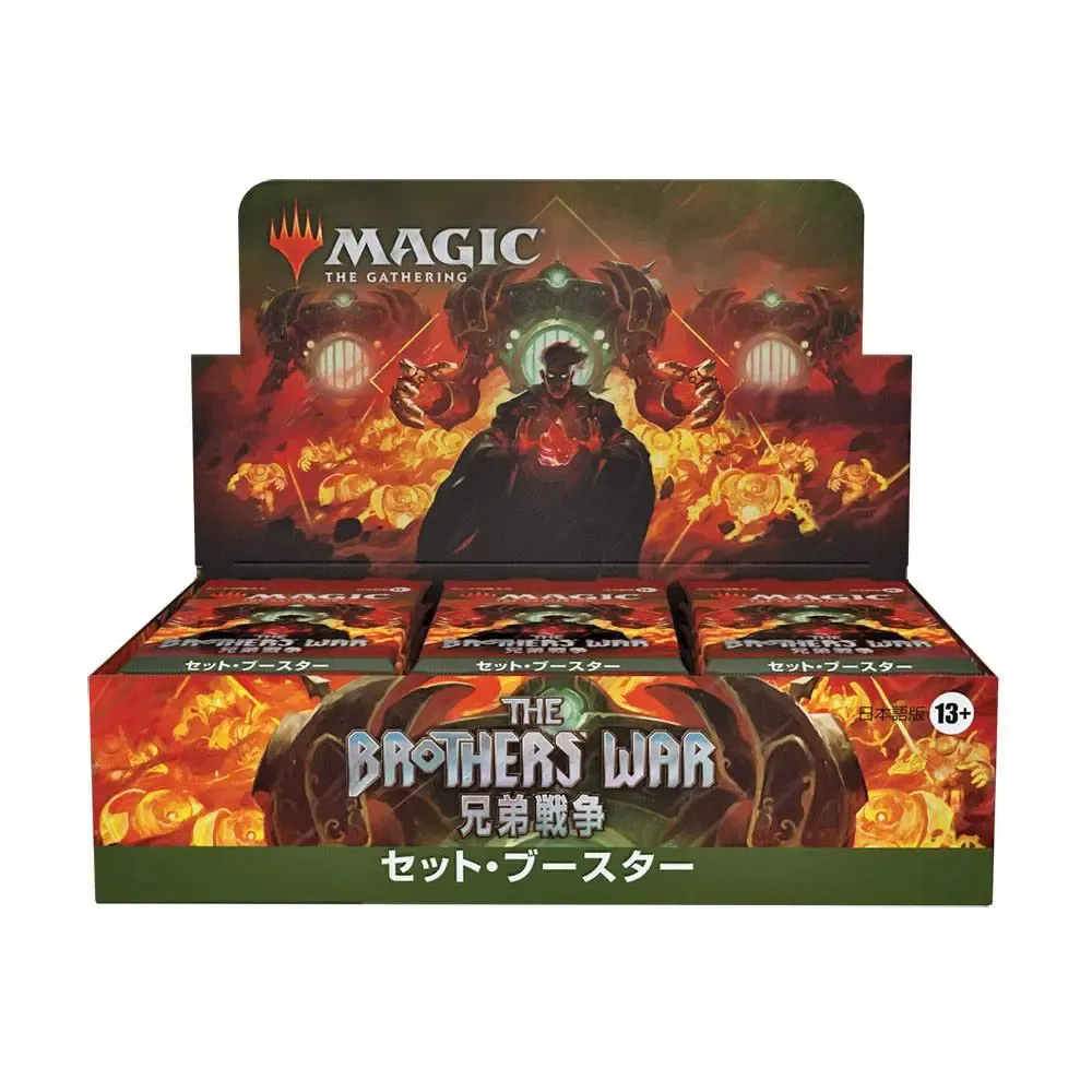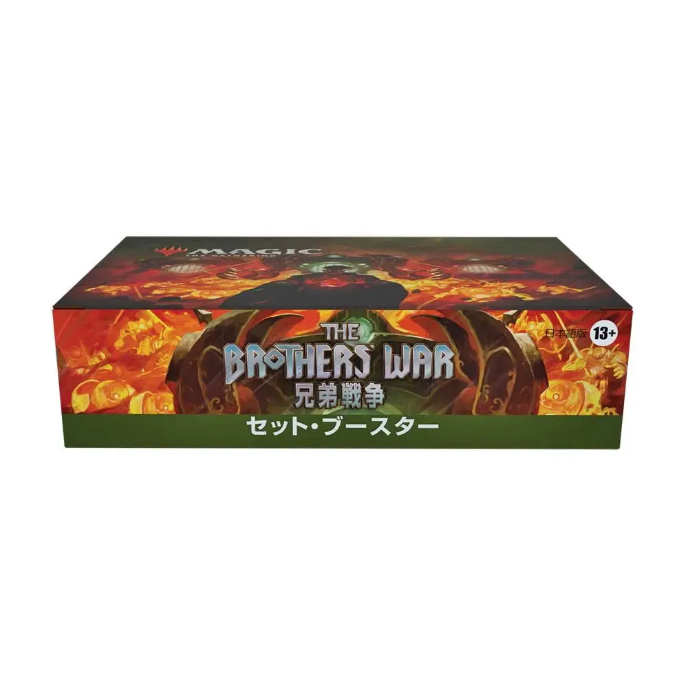 Ein Krieg der Brüder Set-Booster-Display enthält 30 Krieg der Brüder Set-Booster. Jeder Set-Booster enthält 12 Magic-Karten, 1 Artwork-Karte und 1 Spielstein-/Werbekarte oder Karte aus "der Liste" (eine besondere Karte aus der Geschichte von Magic - in 25 % der Booster).