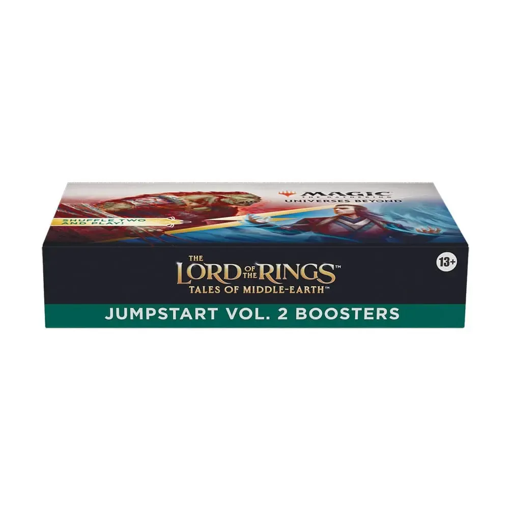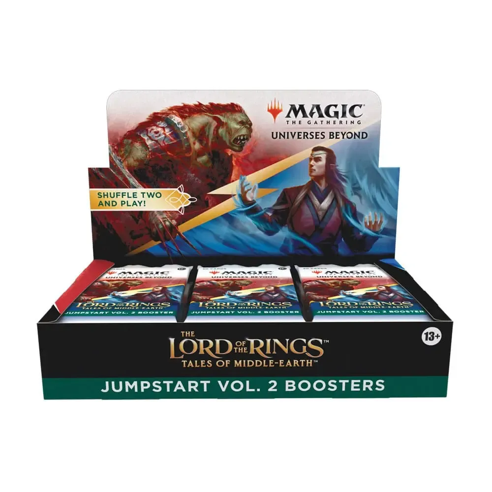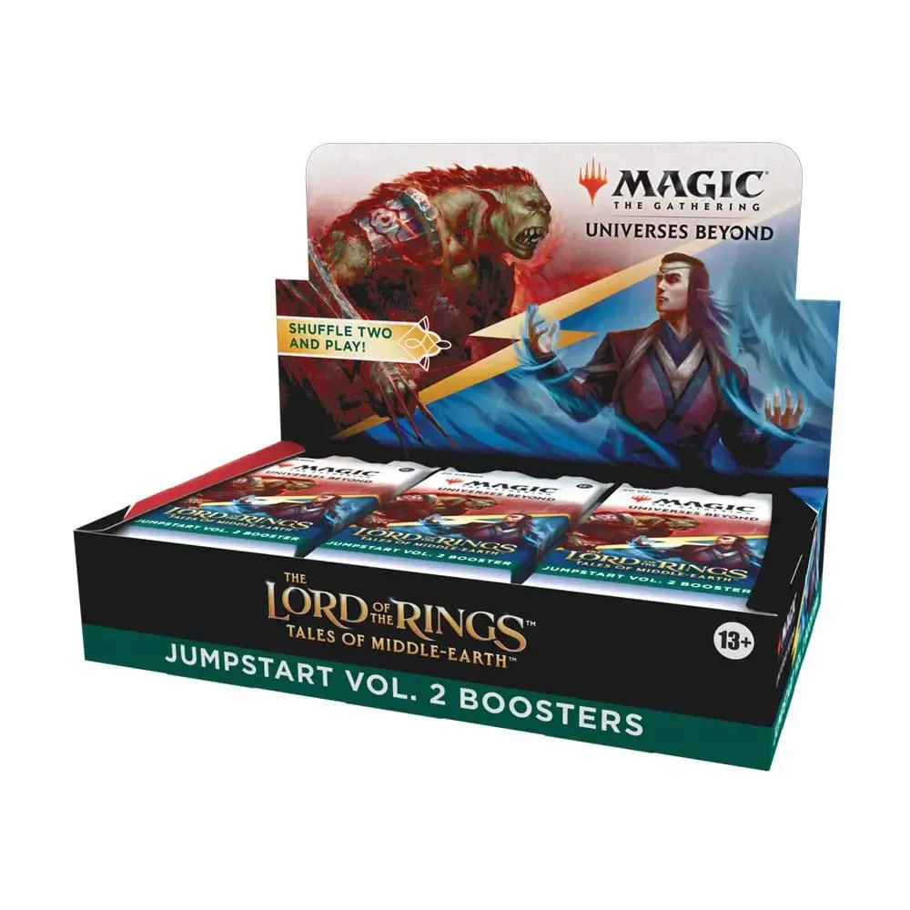 Ein Der Herr der Ringe: Geschichten aus Mittelerde™ Jumpstart Vol. 2 Booster-Display enthält 18 Der Herr der Ringe: Geschichten aus Mittelerde Jumpstart Vol. 2 Booster. Jeder Booster hat ein Thema. Schnappe dir einfach zwei Booster und mische sie für wilde Kombinationen und ein einzigartiges Spielerlebnis zusammen. Ideal für eine schnelle Partie, für alteingesessene Fans, die wieder einsteigen möchten, oder als unterhaltsame Möglichkeit, das Spiel zu erlernen. Jeder Der Herr der Ringe: Geschichten aus Mittelerde Jumpstart Vol. 2 Booster enthält 20 Magic-Karten (darunter alle zum Spielen benötigten Länder). In jedem Booster findest du 2 seltene Karten (1 seltene Karte, die speziell für Jumpstart-Booster entwickelt wurde, und 1 seltene oder sagenhaft seltene Karte aus dem Hauptset) und 2 Länderkarten als funkelnde traditionelle Foilkarten.