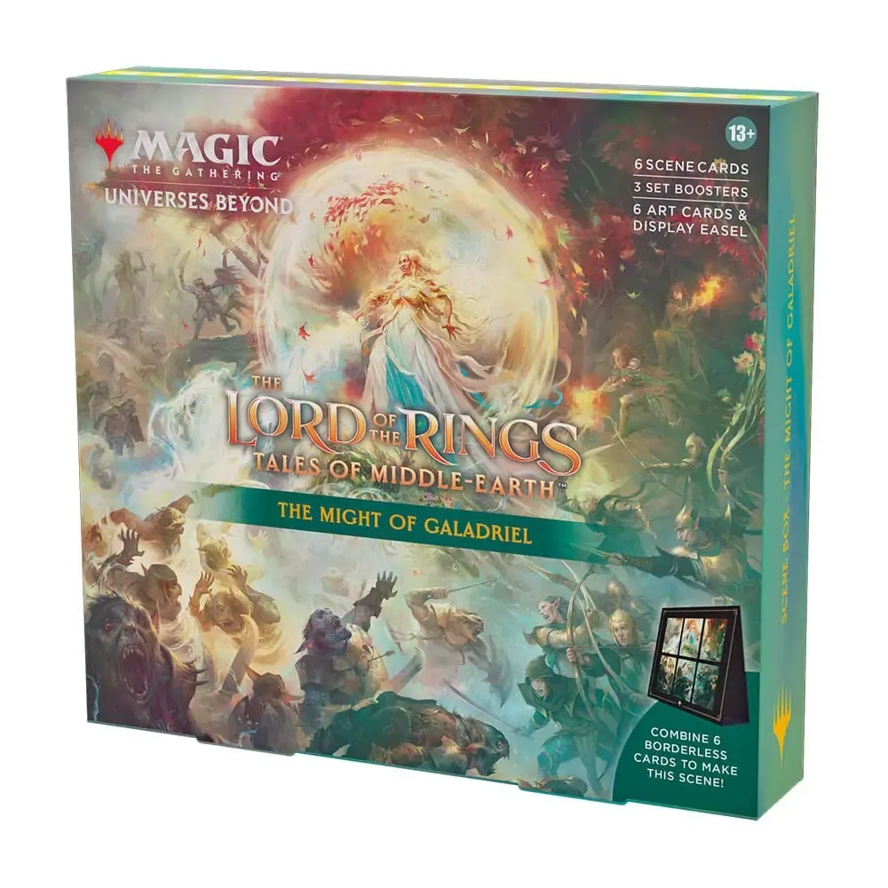 Eine Der Herr der Ringe: Geschichten aus Mittelerde™ Szenenbox enthält 6 Szenenkarten als traditionelle Foilkarten ohne Rand, 6 Artwork-Karten, 3 Set-Booster und einen Aufsteller aus Papier. Jeder Set-Booster enthält 12 Magic-Karten, 1 Artwork-Karte und 1 Spielstein-/Werbekarte, Hilfekarte oder Karte aus "der Liste" (eine besondere Karte aus der Geschichte von Magic - in 25 % der Booster), darunter eine Kombination aus 1-4 Karten der Seltenheit selten oder höher, 3-7 nicht ganz so häufigen Karten, 3-7 häufigen Karten und 1 Länderkarte. In 20 % der Set-Booster ersetzt ein traditionelles Foil-Land das Standardland, und in 10 % der Set-Booster ist statt der Artwork-Karte eine Signatur-Artwork-Karte mit Foil-Stempel enthalten.