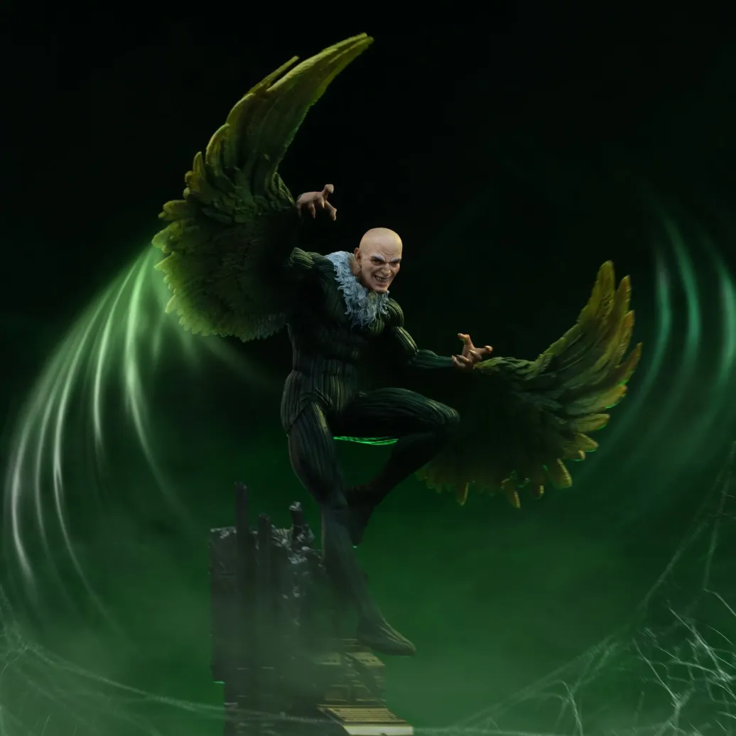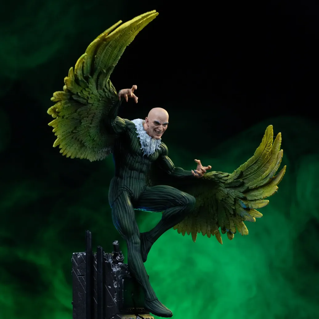 Wer ist Vulture? Vulture ist einer der klassischen Feinde von Spider-Man in den Marvel-Comics. Der Bösewicht ist Adrian Toomes, ein brillanter Ingenieur, der einen technologischen Anzug mit mechanischen Flügeln entwickelte, der ihm die Fähigkeit zu fliegen sowie gesteigerte Kraft und Beweglichkeit verleiht. Angetrieben von Ressentiments und Ehrgeiz wurde Vulture zu einem wiederkehrenden Verbrecher, der den Netzschwinger-Helden häufig am Himmel über New York herausfordert. Sein markantes Erscheinungsbild, das fortschrittliche Technologie mit der Ästhetik eines Raubvogels verbindet, machte ihn zu einem der ikonischsten Gegenspieler von Spider-Man. Über das Produkt: Die von Iron Studios produzierte Vulture-Statue zeigt den Bösewicht mitten im Flug und fängt die imposante Präsenz und dynamische Bewegung der Figur in einer Komposition voller Dynamik ein.