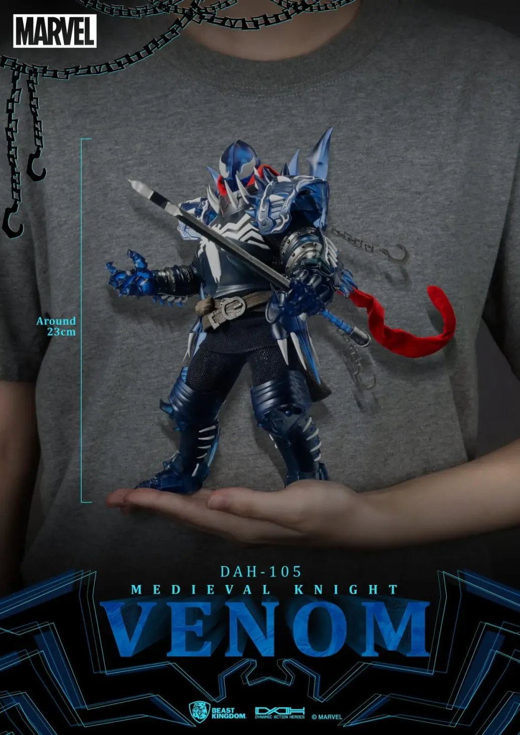 Zu "Venom" kommt diese großartige Actionfigur im Maßstab 1:9 aus der "Dynamic 8ction Heroes" Serie von Beast Kingdom Toys. Sie ist ca. 23 cm groß und wird mit weiteren Austausch- und Zubehörteilen in einer bedruckten Box geliefert.