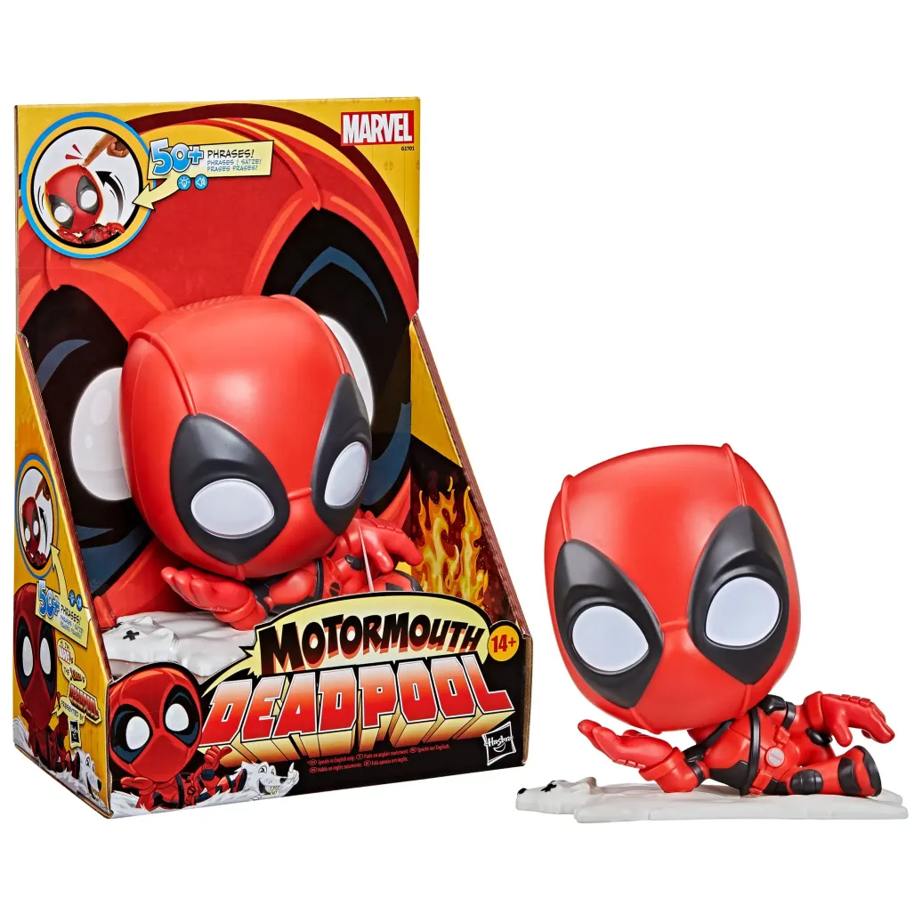 Bei diesem elektronischen Marvel Motormouth Deadpool Spielzeug sollte man sich auf coole Sprüche, witzige Kommentare, messerscharfen Humor und jede Menge Sarkasmus gefasst machen. Wird Deadpools Kopf zur Seite gedrückt, wacht er auf und quatscht drauf los. Was wird er von sich geben? Nun, bei mehr als 50 Sätzen sind die Möglichkeiten ... tja, unvermeidbar endlich, aber mehr als 50? Das ist nicht schlecht, oder? Wird sein Kopf weiter gedrückt, wird er nur noch mehr angestachelt und reagiert und antwortet. Wird der Kopf schnell mehrmals nacheinander gedrückt, wird er noch schnippischer, falls das überhaupt möglich ist- und das nur, weil nervige Quatscherei anscheinend Deadpools größte Superkraft ist. Diese Figur ist ein witziges Marvel Geschenk für Jungs und Mädchen ab 14 Jahren. Aufgepasst? Ab 14 Jahren! Im Ernst, diese Figur mit der großen Klappe eignet sich nicht für jüngere Kids - für diese gibt es stattdessen geeignete Action-Figuren.