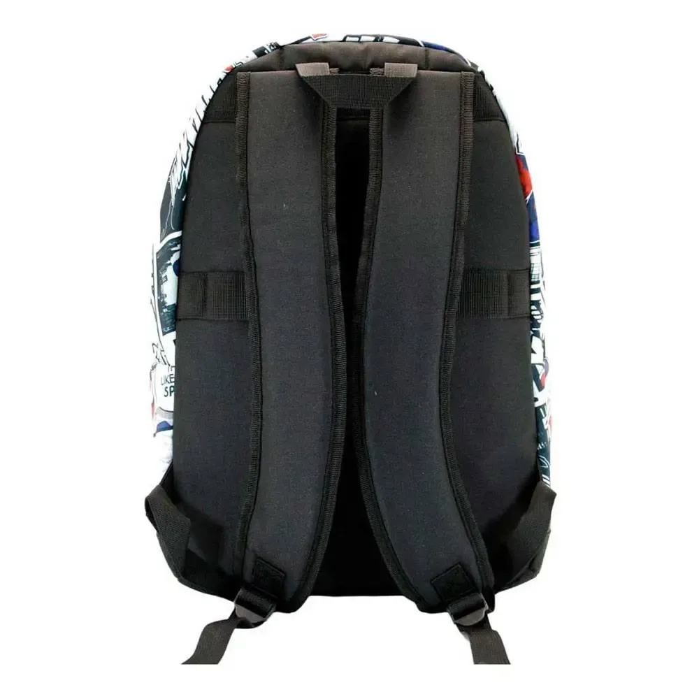 Rucksack mit drei Hauptfächern und zwei Netzseitentaschen. Innenfutter mit gepolstertem Fach für elektronische Geräte und kleiner Reißverschlusstasche. Flüssigkeitsabweisendes Gehäuse, das leichten Flecken und mäßigem Regen standhält.