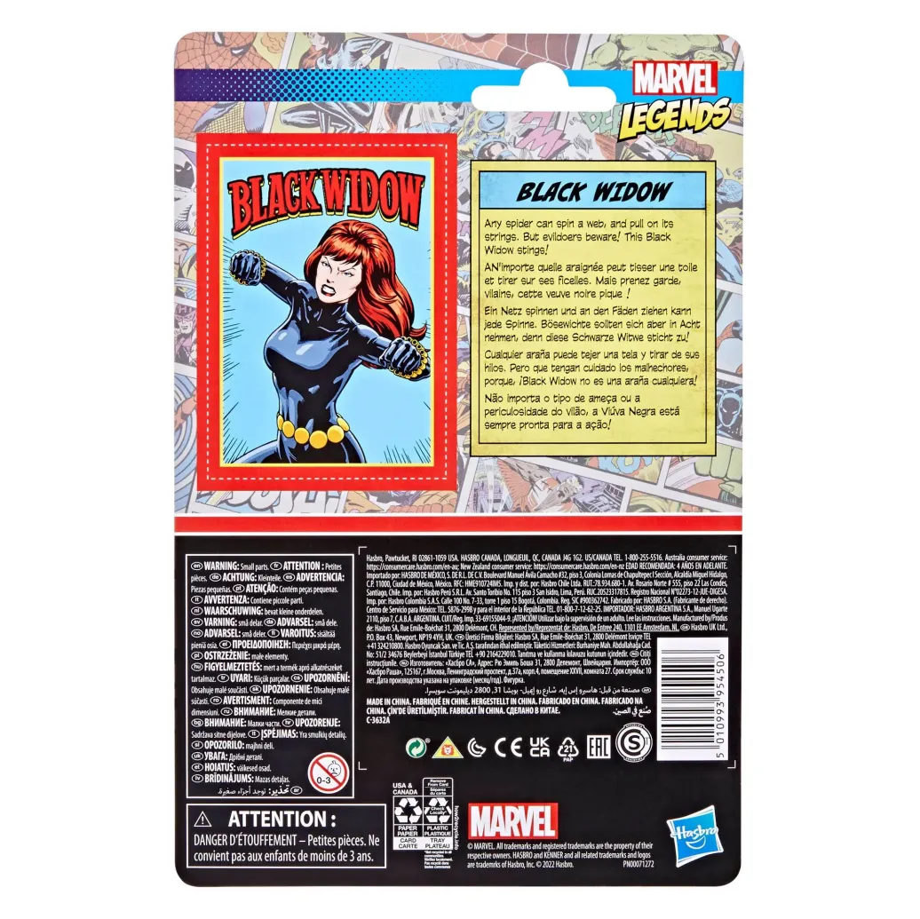 Die 9,5 cm große und hochwertige Black Widow Figur aus der Retro 375 Collection der Legends Series verfügt über mehrere Bewegungspunkte und bringt ein Wurfankergewehr als Accessoire mit