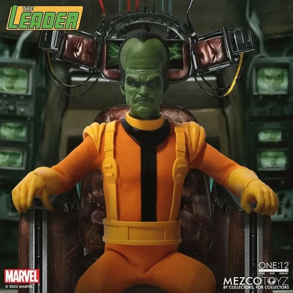 „Das Zeitalter des Intellekts hat begonnen.“ Der Kopf hinter der Bedrohung tritt dem One:12 Collective bei! Verwandelt durch Gammastrahlung entwickelte sich Samuel Sterns zu The Leader, einem Wesen, dessen übermenschlicher Intellekt in einem Duell zwischen Gehirn und Muskeln mit der rohen Kraft des Hulk konkurriert! Jetzt plant der selbsternannte „Meister der Gammakraft“ seinen nächsten Zug aus dem Schatten heraus. The One:12 Collective - The Leader verfügt über 3 austauschbare Kopfporträts, die seine berechnenden Ausdrücke einfangen, von einem finsteren Grinsen bis hin zu wutentbrannter Entschlossenheit. Ausgestattet mit seinem comicgetreuen Kampfanzug ist The Leader mit einem psionischen Verstärker-Stirnband, einer Laserpistole und seinem charakteristischen Gammastrahlen-Blaster ausgestattet, der durch ein flexibles Kabel mit einem Kontroll-Headset verbunden ist. Mehrere austauschbare Hände ermöglichen es ihm, jeden Gegner zu befehligen, zu manipulieren und zu überlisten. Kalt, gerissen und absolut von seiner Überlegenheit überzeugt, hat The Leader immer die Oberhand.