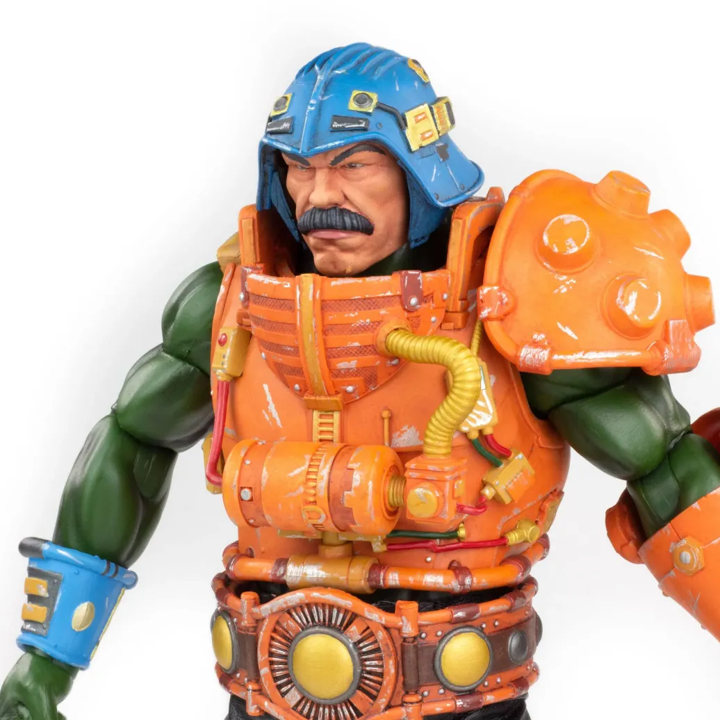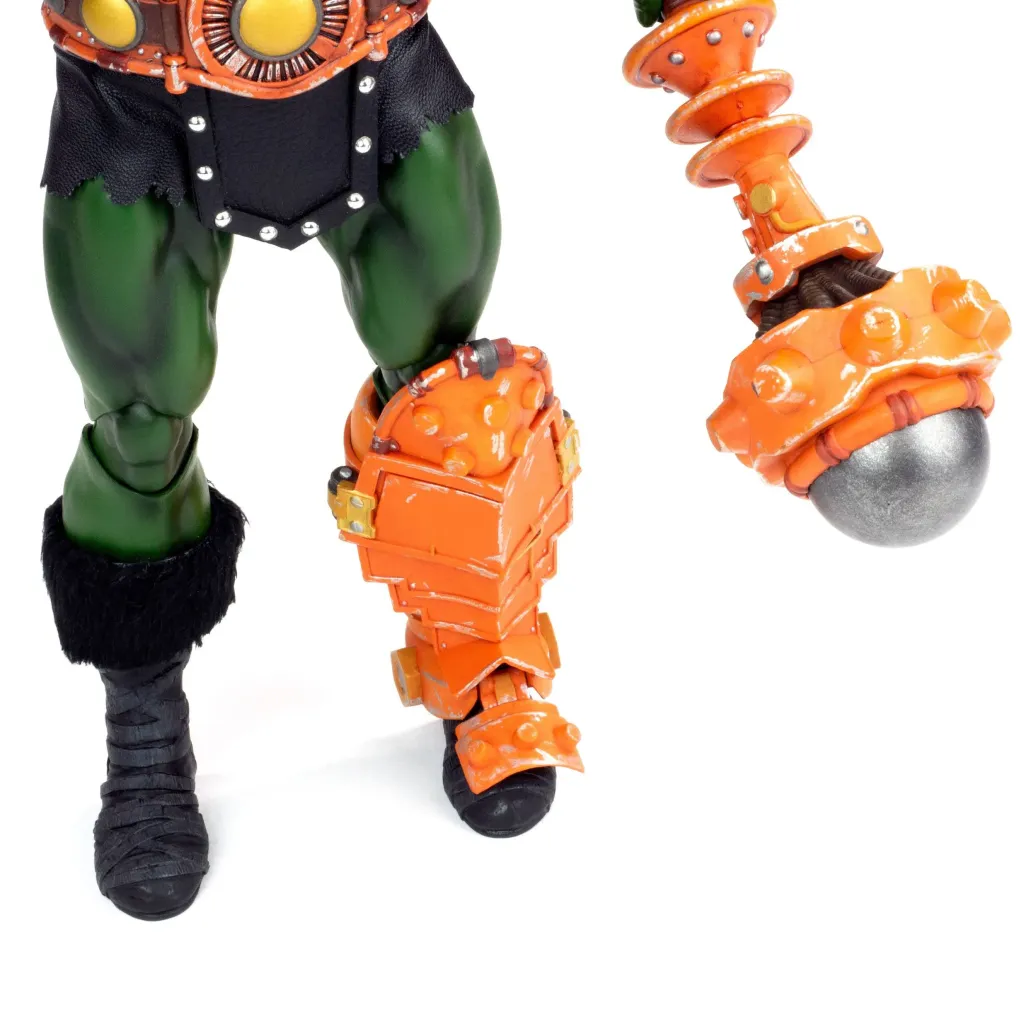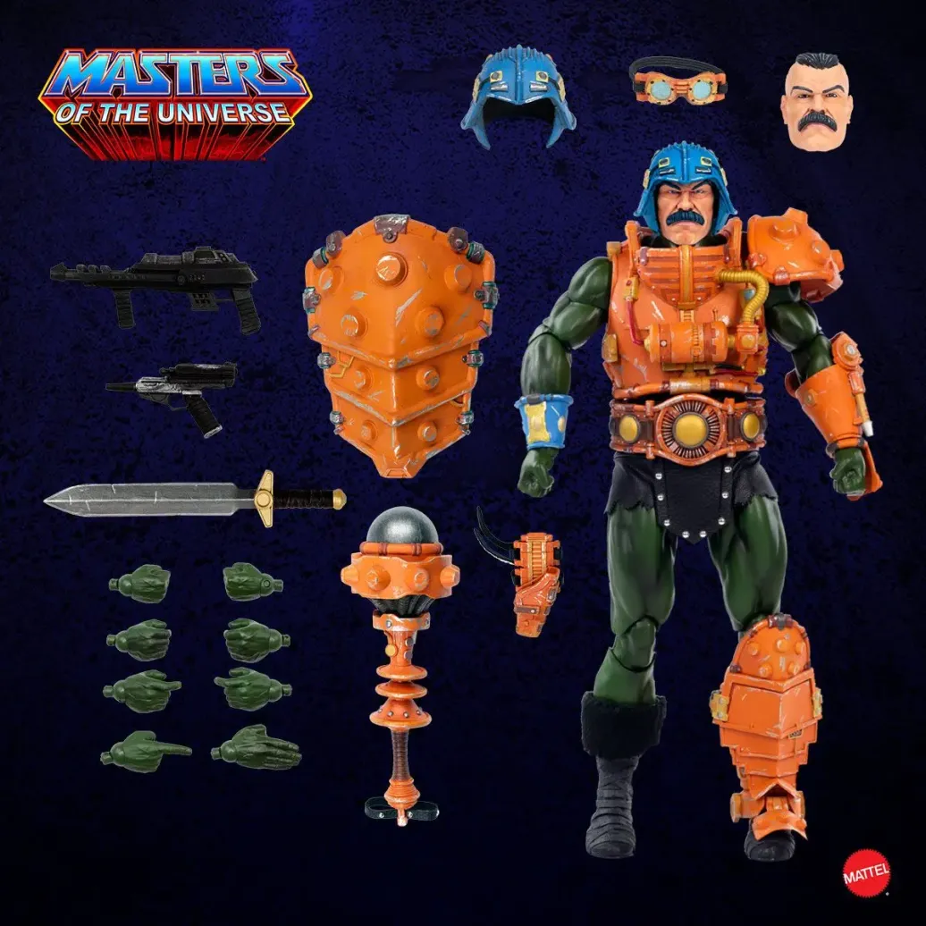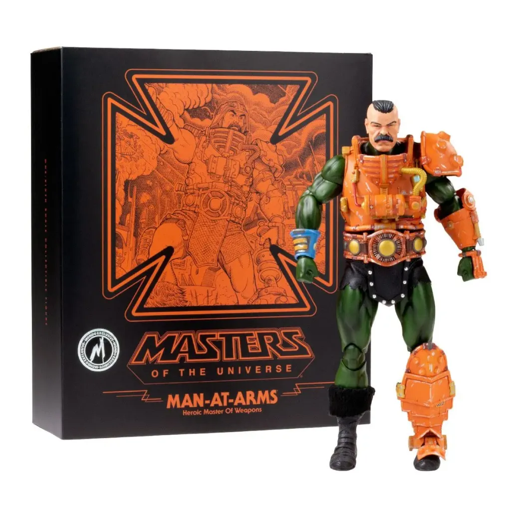 Zu Masters of the Universe kommt diese detailreiche Actionfigur von Man At Arms. Sie ist ca. 30 cm groß und wird mit weiterem Zubehör und austauschbaren Teilen in einer bedruckten Box geliefert.