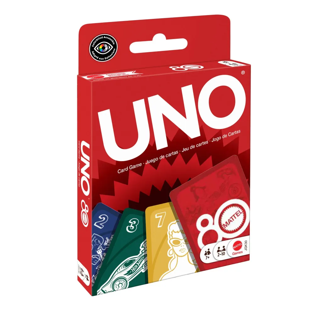Fans der vielen großartigen Spiele von Mattel werden die Ruby Red-Version von UNO zum 80. Jubiläum lieben. Mit Karten, auf denen verschiedene Mattel-Produkte abgebildet sind, versuchen die Spieler wie bei der klassischen Version passende Farben und Zahlen zu finden! Und natürlich dürfen die Spieler nicht vergessen, laut UNO!" zu rufen, wenn sie nur noch eine Karte auf der Hand haben! Ein tolles Geschenk für Fans der Spielzeuge und Spiele von Mattell sowie Liebhaber von Kartenspielen ab 7 Jahren. Abweichungen in Farbe und Gestaltung vorbehalten.