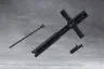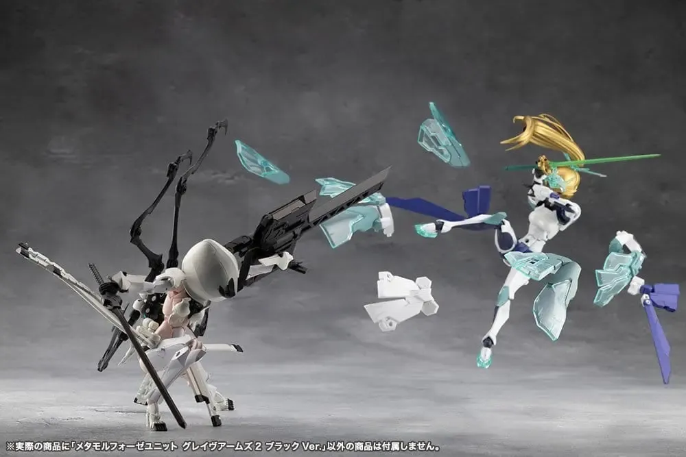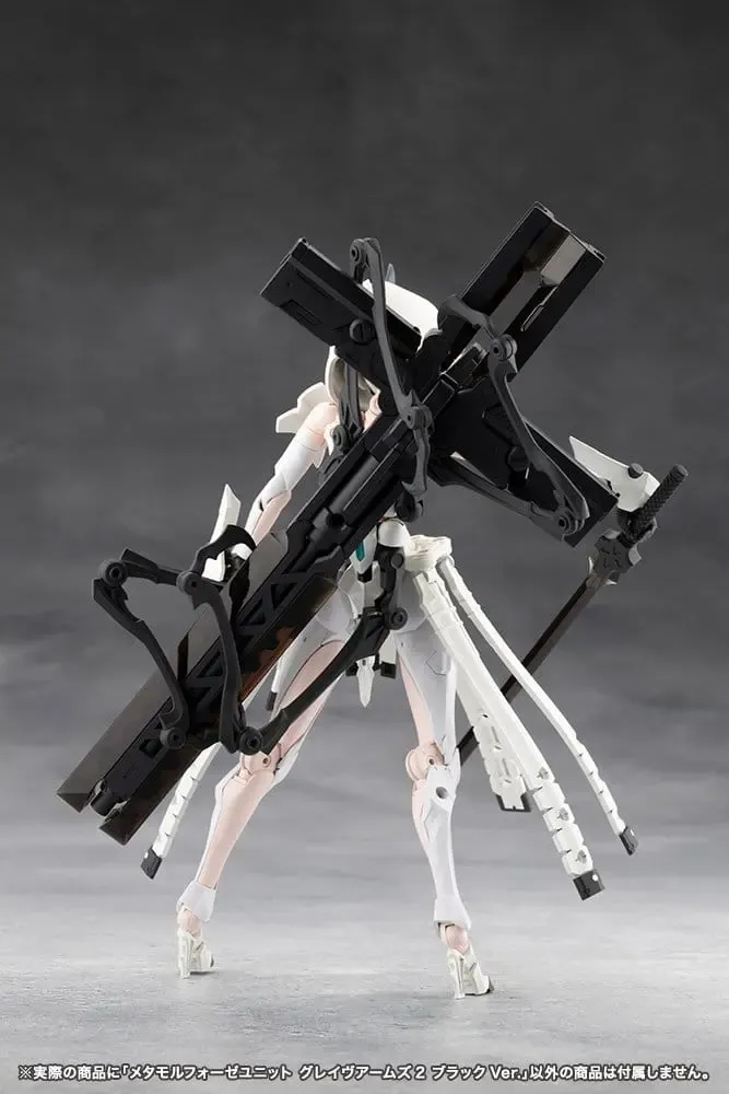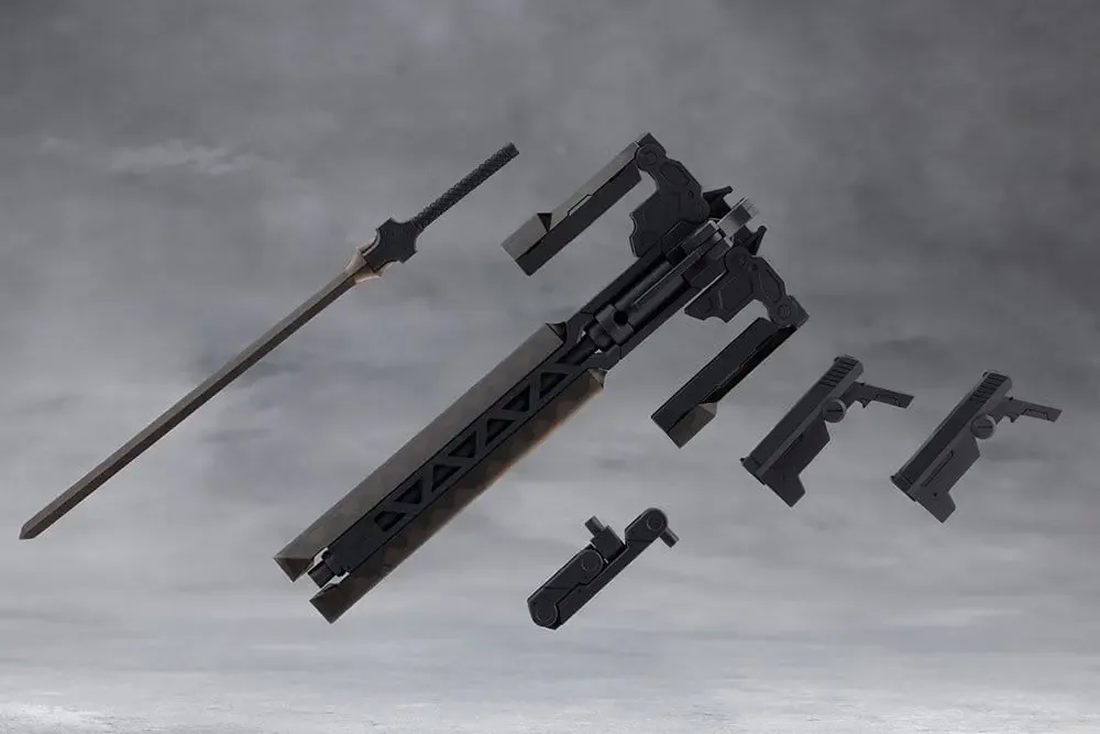 Dieses Set ist eine Farbvariante der METAMORPHOSE UNIT GRAVE ARMS2 mit unterschiedlichen Gussfarben. Grave Arms2 ist eine Kombinationswaffe, die einem Kreuz ähnelt. Während die Hauptwaffe eine riesige Kanone ist, dient sie auch als große Scheide für eine Laserklinge und zwei Handfeuerwaffen. Zusätzlich zur Verwandlung in ein großes Schwert kann der Griff abgenommen und an den mitgelieferten Effektteilen befestigt werden, um eine tödliche Laserklinge zu erzeugen, die jede heldenhafte Actionszene belebt. Die Waffe kann auch mit dem gelenkigen Befestigungsarm an verschiedenen Stellen montiert werden. Die beiden Handfeuerwaffen können auch von der Hauptkanone abgenommen und separat verwendet werden. Das Set ist in zwei Farben geformt, schwarz (Ghillie Dhu-Farbe) und klarem Schwarz (Necro Face-Farbe).